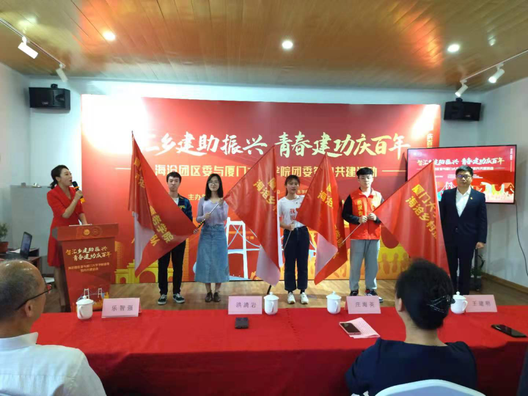 在签约授旗仪式上,海沧区委副书记庄海英首先致辞。她对厦门大学师生代表的到来表示热烈欢迎,对百年厦大人才培养及海沧区在乡村振兴取得的成效表示肯定。她认为,高校青年服务于乡村振兴建设有重要意义,希望海沧团区委深化与厦门大学学院团委的合作共建,双方充分利用资源优势,建立长效合作机制,共同发展,持续推进乡村振兴,实现校地共青团工作的合作共赢。
