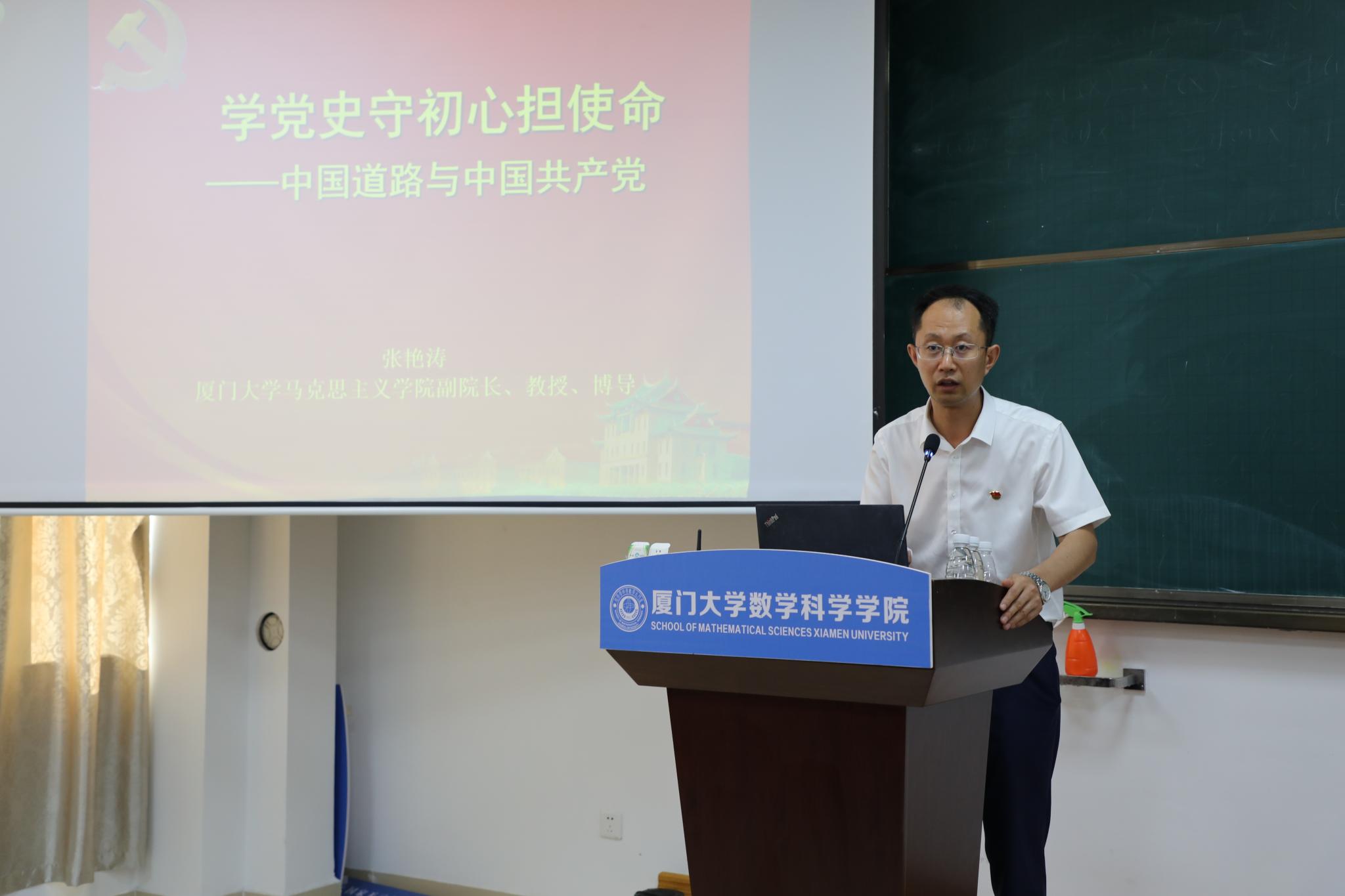 6月3日下午,数学科学学院党委在海韵园实验楼105报告厅举办党史学习教育第二场理论报告会,邀请马克思主义学院副院长张艳涛教授来院作报告。院系领导、党支部书记、支委和师生党员代表参加会议,院党委书记黄宝秋主持报告会。