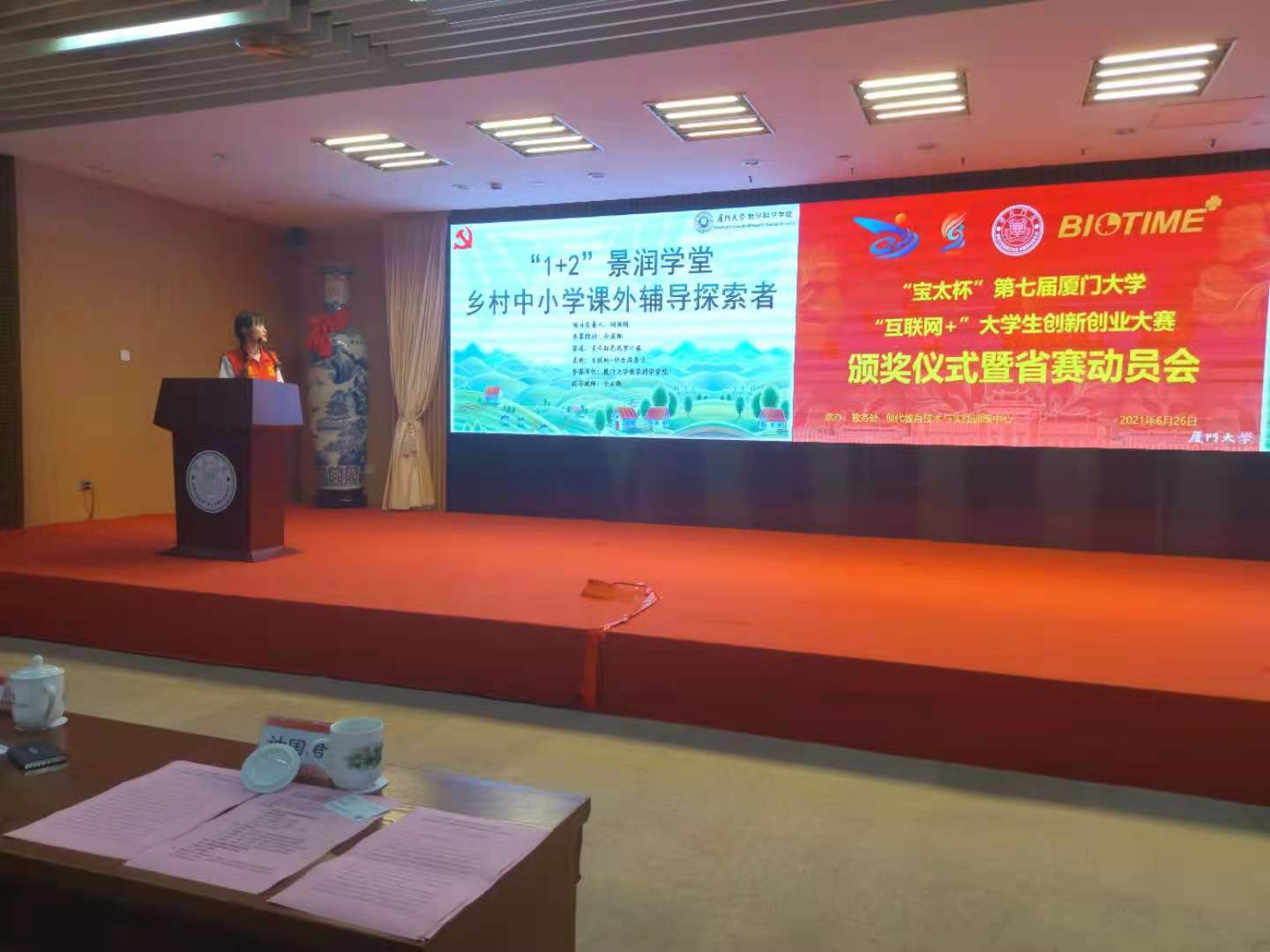 近日,“宝太杯”第七届厦门大学“互联网+”大学生创新创业大赛落下帷幕,数学科学学院斩获1金1银2铜的优异成绩,并获得优秀组织奖。学院红旅赛道项目《“1+2”景润学堂:乡村中小学课外辅导探索者》在颁奖仪式上进行现场路演。