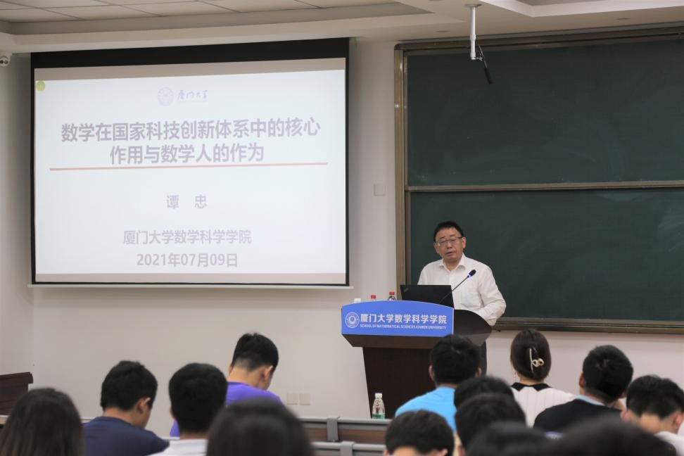 7月9日下午,厦门大学科技处党支部联合数学科学学院本科生党支部、硕士基础数学党支部等在海韵园实验楼106会议室开展“我为师生办实事”实践活动。科技处党支部书记、数学科学学院谭忠教授进行主题为“数学在国家科技创新体系中的核心作用和数学人的作为”的专题讲座,为数学科学学院即将面临科研方向选择的本科三年级和硕士一年级的100多名学生进行科研指导。讲座由数学科学学院党委副书记丁昌利主持。