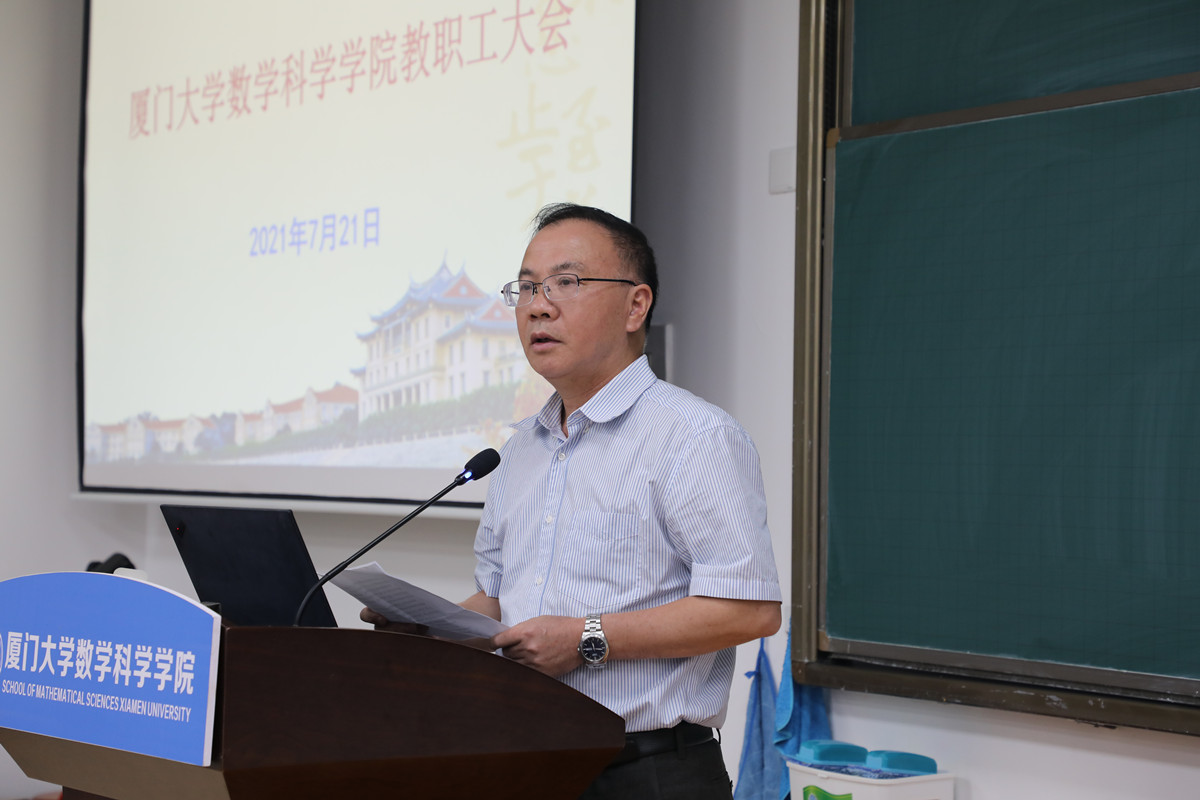 会上,黄宝秋结合学校《KY.COM认真学习贯彻习近平总书记在庆祝中国共产党成立100周年大会上的重要讲话精神的通知》要求,再次传达学习习近平总书记“七一”重要讲话精神,报告学院3月下旬以来扎实推进党史学习教育各项工作所取得的阶段性成效,肯定了学院在庆祝百年校庆和建党百年活动以及党建思政、教书育人、科学研究、志愿服务、群团工作等方面所取得的成绩,并就几项重点工作作了强调。他指出,习近平总书记“七一”重要讲话是一篇马克思主义纲领性文献,是新时代中国共产党人不忘初心、牢记使命的政治宣言,是我们党团结带领人民以史为鉴、开创未来的行动指南,要深入领会“七一”重要讲话精神的重大意义和丰富内涵,把学习“七一”重要讲话精神同当前开展的党史学习教育结合起来,同学习贯彻落实习近平总书记致厦门大学建校100周年贺信精神结合起来,同统筹推进“双一流”建设结合起来,不断把学习“七一”重要讲话精神引向深入。他认为,了解历史才能看得远,理解历史才能走得远,我们有幸见证了伟大的中国共产党领导全国人民决战决胜脱贫攻坚、全面建成小康社会,有幸见证了中国共产党成立100周年,有幸见证了厦门大学庆祝建校100周年的辉煌时刻,还将继续参加、见证我国于2035年基本实现社会主义现代化、于本世纪中叶建成富强民主文明和谐美丽的社会主义现代化强国,要更加坚定在新时代与党一起创业的信心和决心,把学习“七一”重要讲话精神和开展党史学习教育的成果转化为奋进新征程、建功新时代的实际行动,努力在实现“两个一百年”奋斗目标的宏伟征程中作出应有贡献。他强调,学院取得的各项发展成就得益于这个伟大的时代,得益于大家撸起袖子加油干,得益于和谐向上的集体,希望大家继续发扬自强不息、止于至善的校训精神和陈景润先生的科学精神,不忘初心,砥砺前行,努力在新百年新征程中展现数学人的新风采。