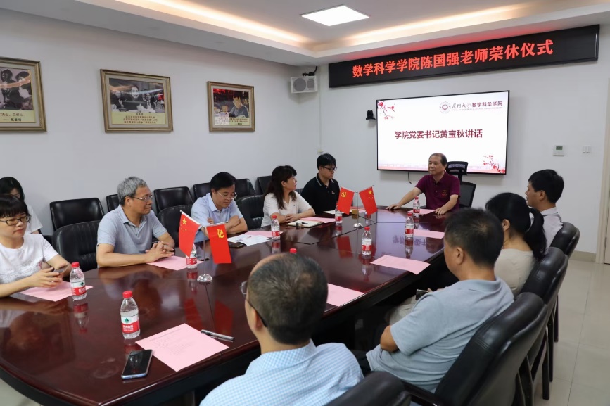 7月23日上午,数学科学学院在海韵园行政楼313会议室为今年7月退休的陈国强老师举行荣休仪式。学院党委书记黄宝秋、副院长邱建贤、工会主席伍火熊、妇委会主任吴聪敏,学校人事处专员蓝亦芃,学院教师代表、党政管理人员代表、学生代表共同参加本次活动。仪式由学院党委副书记丁昌利主持。