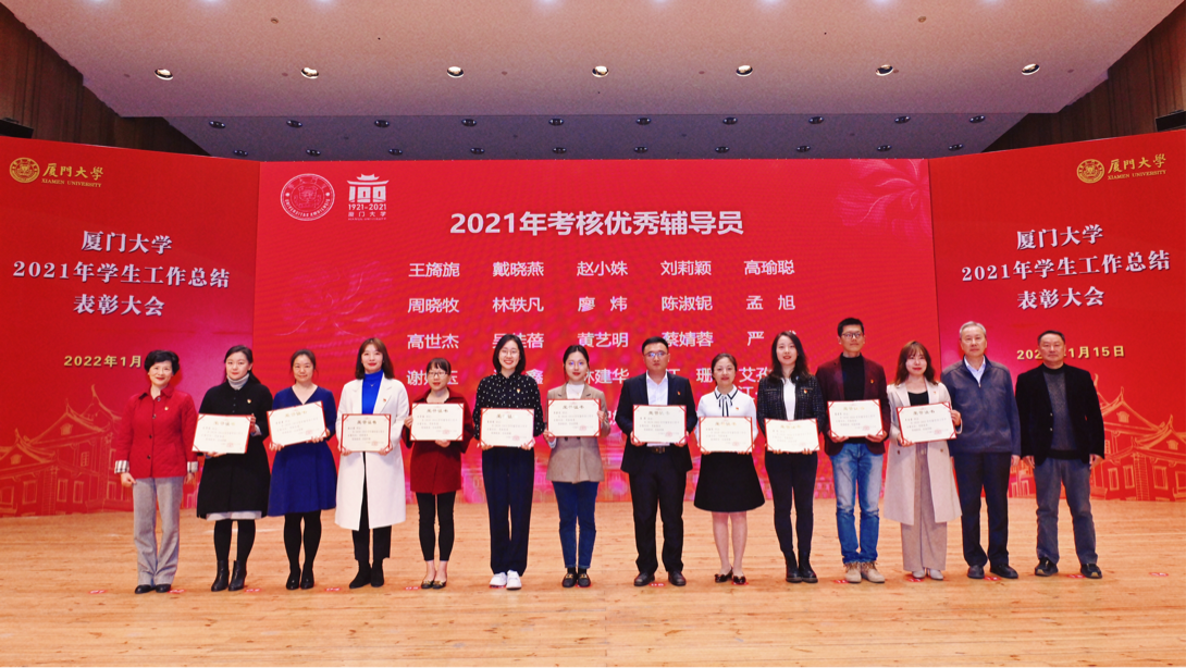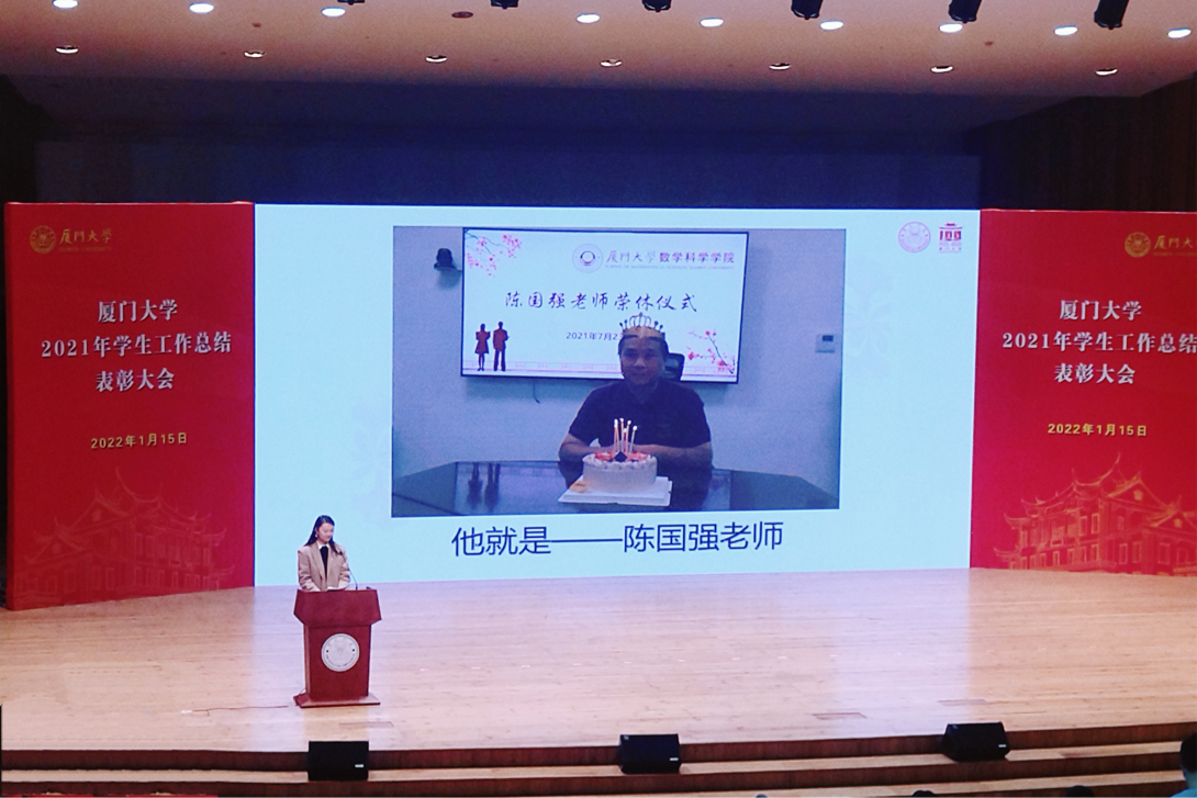 1月15日,厦门大学2021年学生工作总结表彰大会在科学艺术中心音乐厅举行。校党委副书记徐进功出席会议并讲话。校关工委顾问黄如彬,校党委常委、组织部部长、统战部部长孙理,校关工委副主任白锡能、梁卫中、郑冰冰,学校相关部门单位领导出席会议。数学科学学院党委副书记毛通双、丁昌利,团委书记于正伟,团委副书记陈淑铌,专职辅导员华盈鑫,党政辅导员陈依杭参加总结表彰大会。