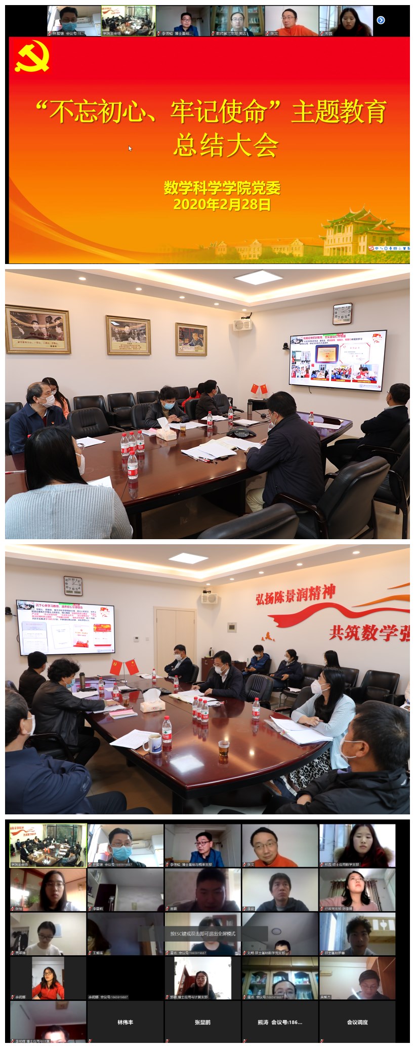 根据校党委统一部署,2月28日下午,数学科学学院“不忘初心、牢记使命”主题教育总结会在海韵园行政楼313会议室召开。校党委第四巡回指导组组长司卓亚、学院党委委员、部分党员代表在做好个人防护的情况下现场参加会议,全体党支部书记,其他党员、师生代表通过随会网络视频会议平台参加会议。