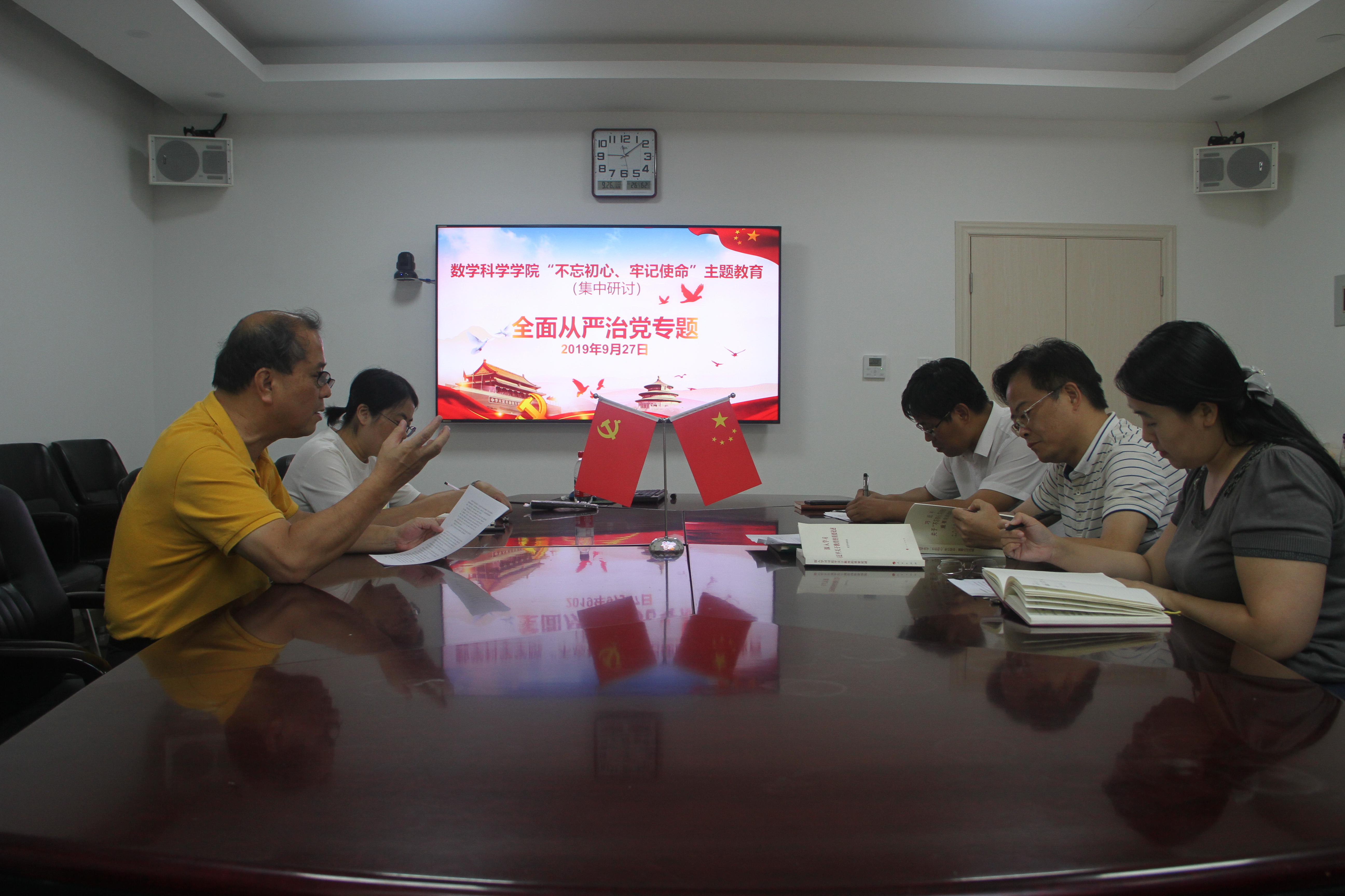 主题教育开展以来,数学科学学院党委紧扣“不忘初心、牢记使命”的主题和学习贯彻习近平新时代中国特色社会主义思想的主线,自觉将学习研讨抓在前头、贯穿始终,努力做到理论学习有收获。院党委突出处级党员领导干部教育重点,通过领学、主发言、交流发言、观看专题片、现场教学等方式,引导大家读原著、学原文、悟原理,推动学懂、弄通、做实。目前已开展两次集中学习研讨。