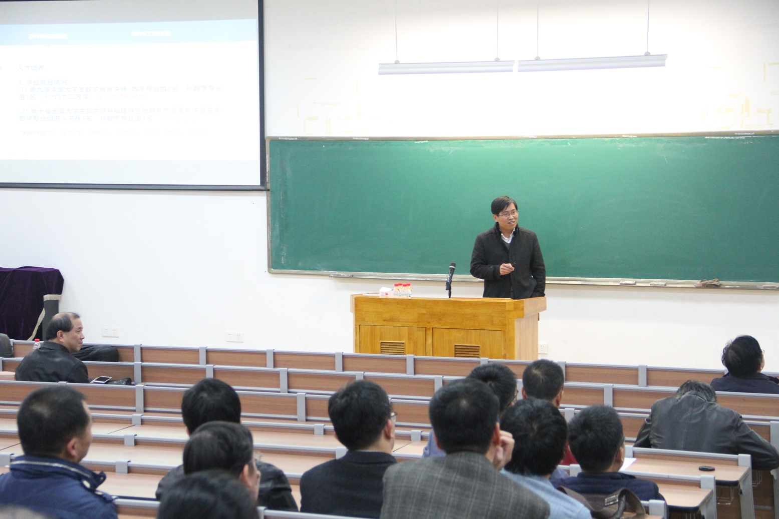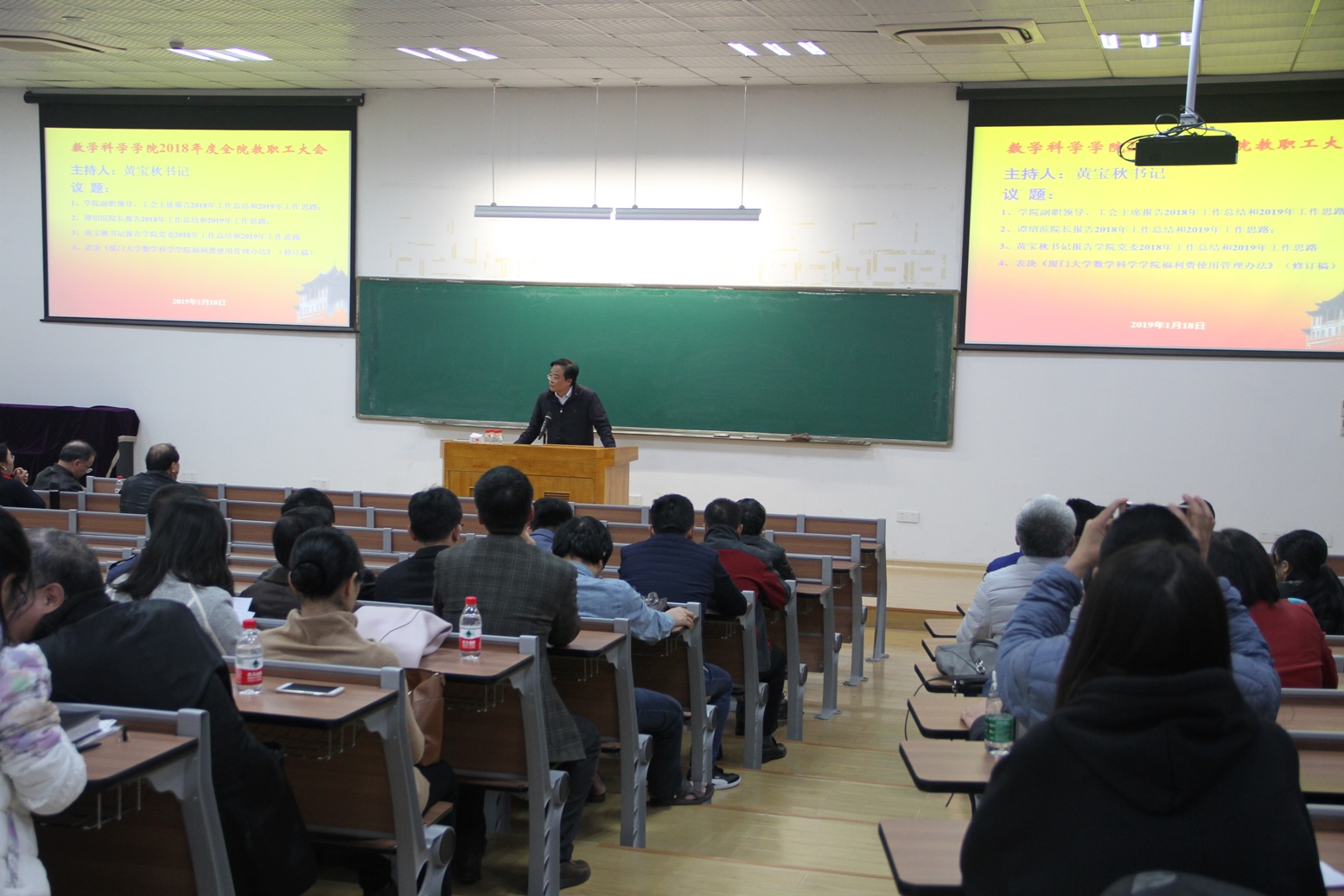 谭绍滨院长结合2018年初在全院教职工大会上提出的工作设想对学院2018年度的工作进行总结,分析成绩,查找不足,向全体教职员工报告了国家天元数学东南中心申报筹建过程和国家天元数学东南中心的建设进展,提出学院2019年将要开展的重点工作。谭院长指出,2018年学院取得不错的发展成绩,获批建设国家天元数学东南中心,实现了国家级教学成果奖零的突破,到账科研经费达到历史最高水平,全体教职员工要积极申请校外科研项目,积极组织或参与高层次的学术交流活动,努力为人才培养、科学研究和学科建设做出应有贡献,推动学院事业迈向更高台阶。