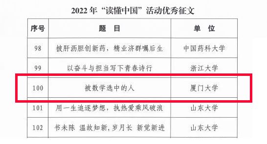 近日,由教育部关工委主办的2022年“读懂中国”活动获奖作品名单公布,我院征文作品《被数学选中的人——记厦门大学“南强杰出贡献奖”获得者钟同德教授》获“优秀征文”奖项,为全校唯一获奖的征文作品。