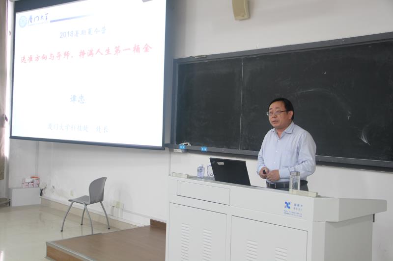 7月14日下午,学院在海韵园校区教学楼404教室举行学院夏令营开营式,学院党委书记黄宝秋、副院长张剑文、副院长金贤安、国家教学名师林亚南教授出席了开营式,陈国强副书记主持开营仪式,在愉快而热烈的气氛中,黄宝秋书记首先代表学院对营员们的到来表示热烈欢迎,并向同学们介绍了学院的历史发展、学科建设、师资队伍和人才培养等方面的概况,让同学们对厦门大学数学科学学院有更清晰的认识。随后,副院长张剑文教授向同学们介绍了我校浓厚的人文情怀以及我院在硕士、博士招生方面的政策,鼓励同学们选择厦大、选择数学。来自华中科技大学数学与统计学院的刘敏同学则作为营员代表做了发言,表达了对厦门大学和数学科学学院的感谢,也表达了对厦大校园的喜爱。
