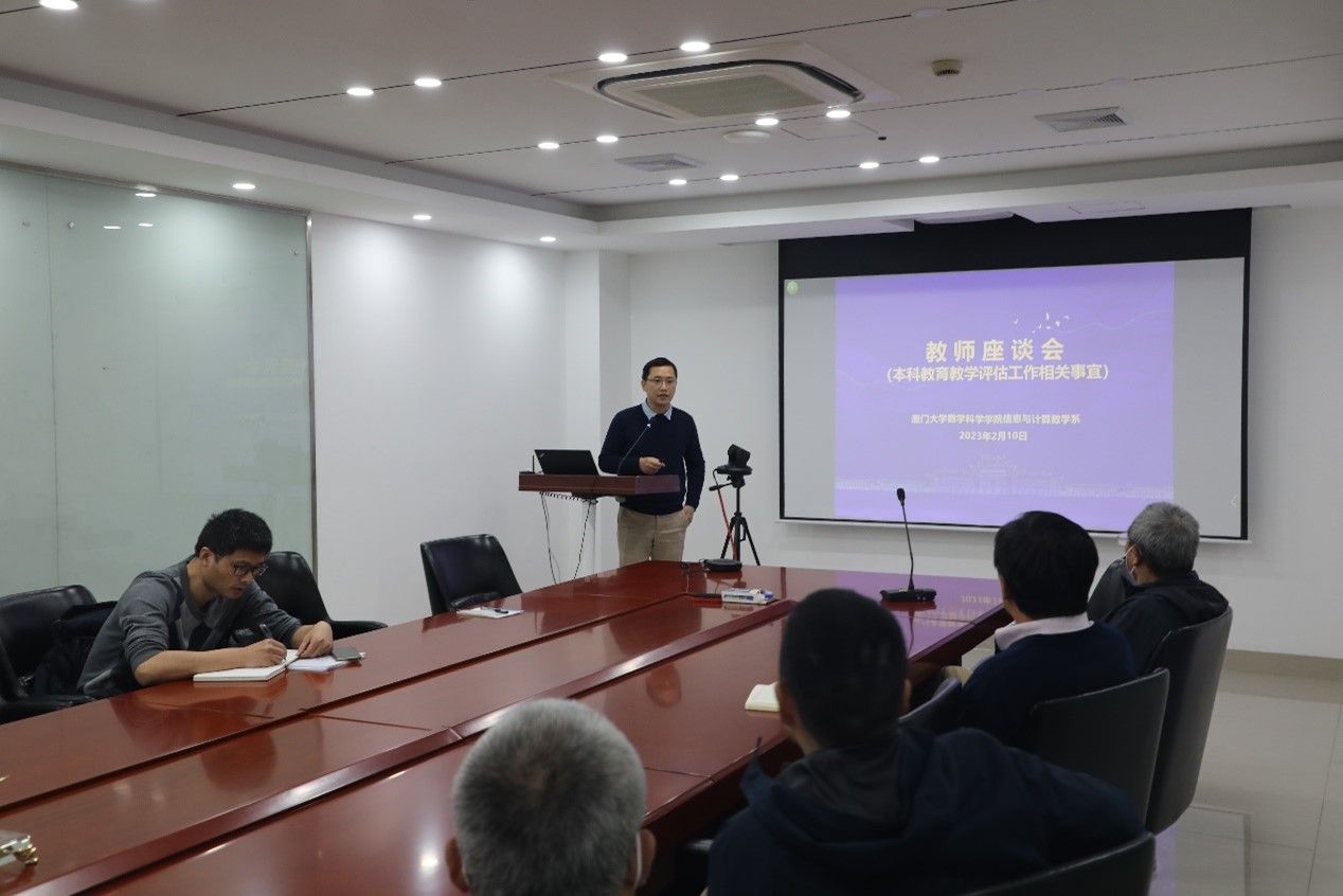 数学与应用数学系、信息与计算数学系、概率统计系教师座谈分别于2月10日下午和2月13日上午召开,各系教师代表参加会议,会议分别由数学与应用数学系系主任夏超、信息与计算数学系系主任陈黄鑫、概率统计系系主任周达主持。会上各系系主任介绍了本科教育教学评估的相关事宜,包括前期准备工作以及接下来各位教师及课程组组长的相关工作安排,具体包含课程教学档案、本科毕业论文、教学信息维护以及课程组档案的相关要求;同时也对学院强基计划与拔尖计划的培养方案进行了介绍和探讨。在交流环节,参会教师们畅所欲言,针对课程思政工作、本科教学实验室、课程组工作、数据科学专业设置等本科教育教学以及人才培养工作提出许多建设性意见。