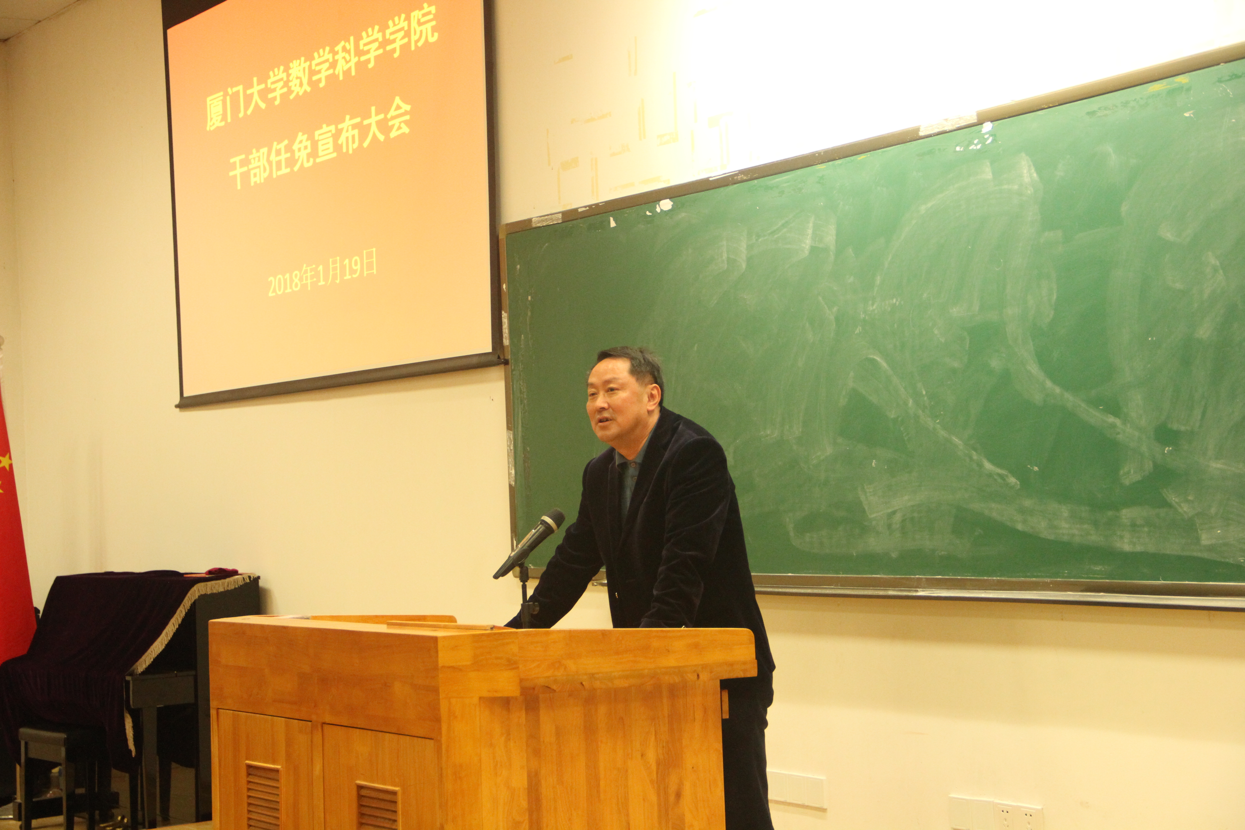 2018年1月19日下午,数学科学学院在数理大楼117教室召开教职工大会。校党委副书记、副校长李建发在会上宣读了校党委KY.COM数学科学学院党委书记、副书记职务任免的决定并作讲话。校党委组织部部长梁卫中主持会议。学院党政班子成员、全体教职工出席会议。