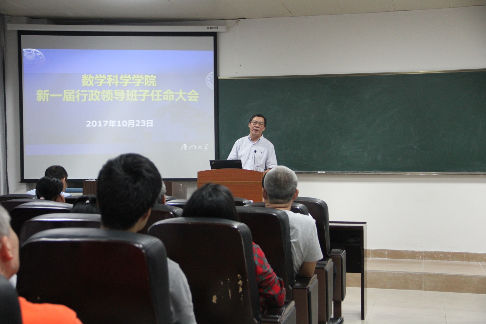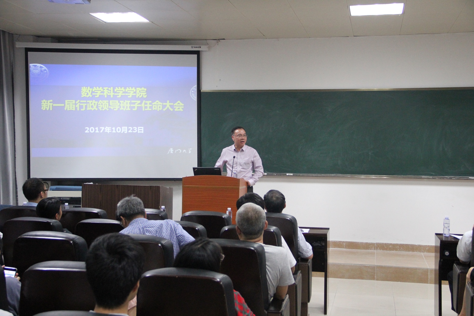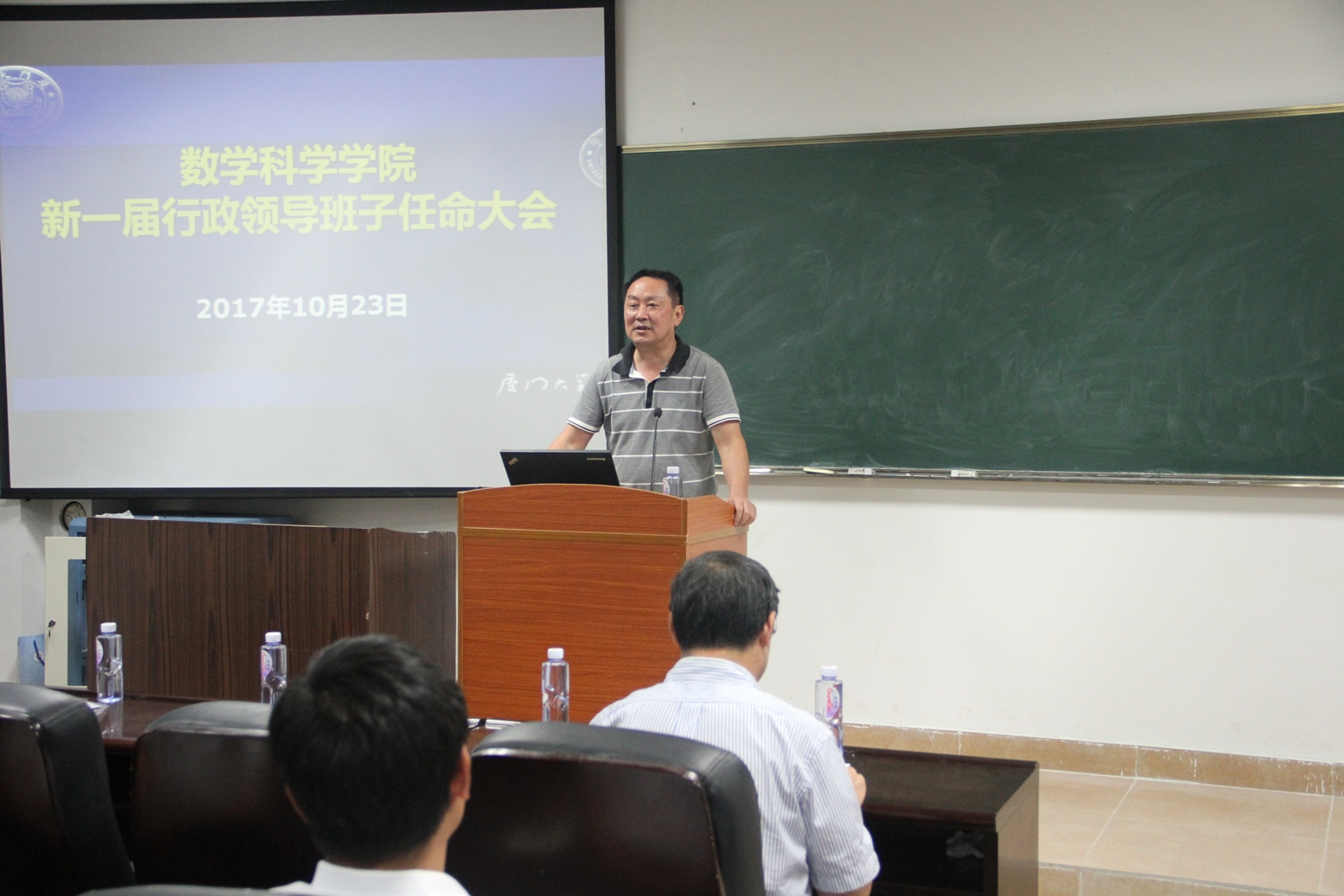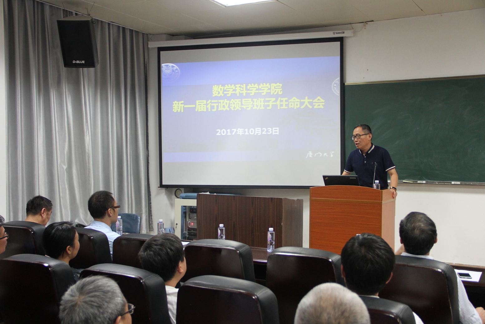 10月23日下午,学院召开新一届行政领导班子任命大会,校党委副书记、副校长李建发出席会议并宣布校党委决定:谭绍滨教授兼任学院院长,张剑文教授任副院长,邱建贤教授和金贤安教授任副院长(试用期一年),邱建贤、金贤安任中共厦门大学数学科学学院委员会委员。