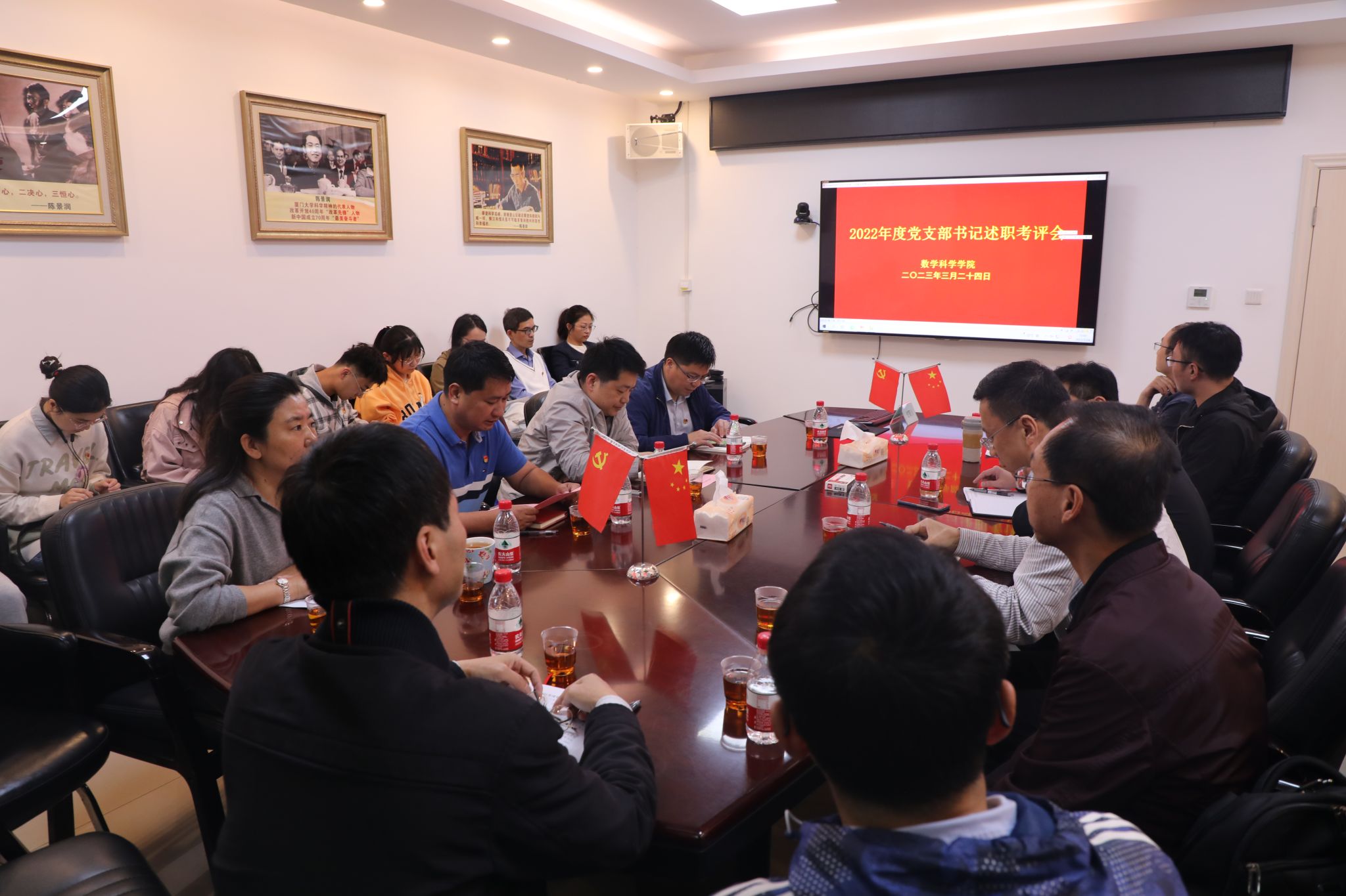 会前,学院党委按照校党委《KY.COM开展2022年度基层党组织书记抓基层党建工作述职评议考核的通知》和《数学科学学院党支部书记述职评议考核工作暂行办法》要求,精心制定会议方案,组织支部书记撰写述职报告,为会议召开做好充分准备。会上,各支部书记围绕学习贯彻习近平新时代中国特色社会主义思想和党的二十大精神、在落实中心任务中发挥党支部和党员作用、落实学校党建重点任务、落实基层党建责任制等情况进行述职。述职过程聚焦基层党建质量提升,注重用具体事例和数据说话,对标党的二十大增强党组织政治功能和组织功能的要求,查问题、找短板、提措施。联系支部的院党委委员对照述职考核办法和党支部工作责任清单,综合平时掌握的情况和现场述职内容对支部工作进行逐个点评,全体与会人员现场给支部书记打分。