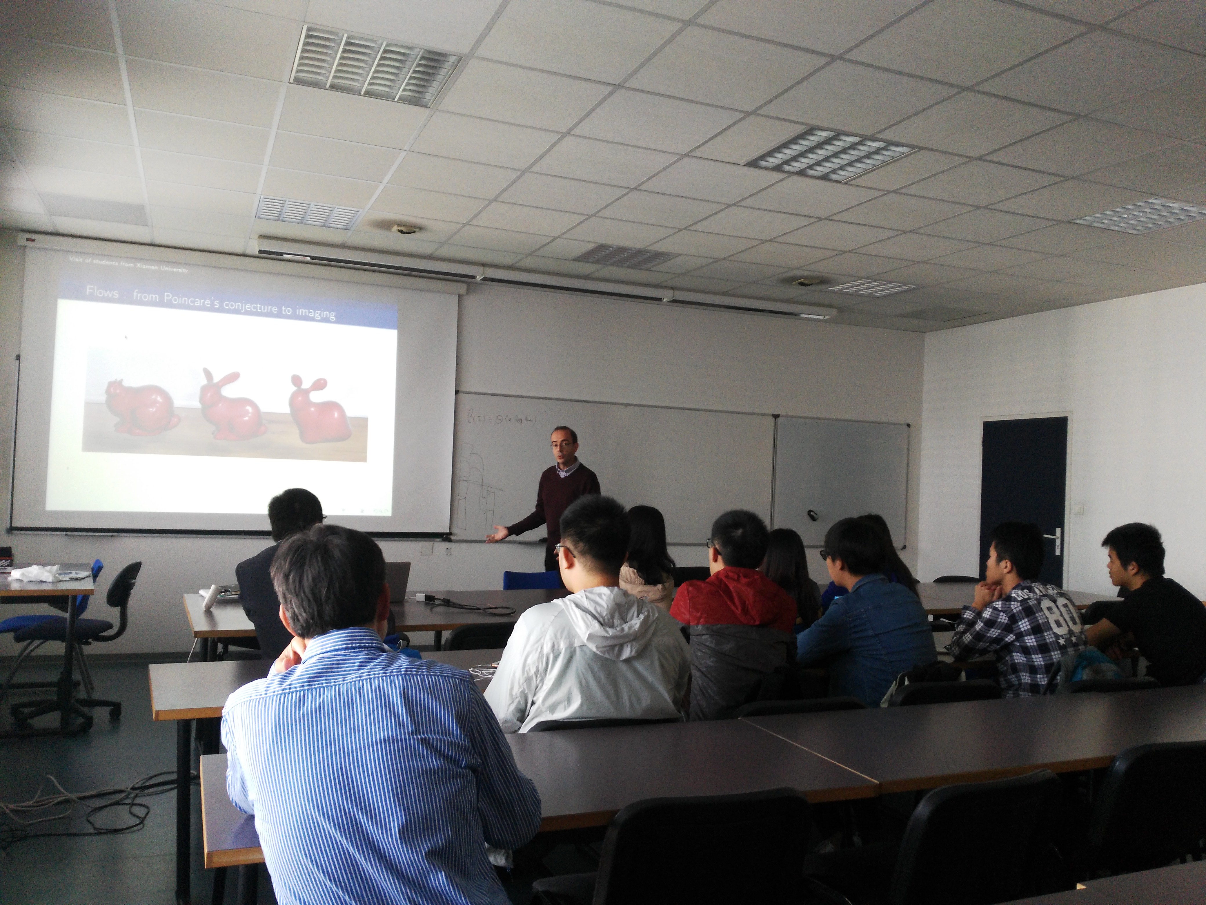 2017年9月10日,访问团赴波尔多大学数学系/数学研究所进行交流。在我院“闽江学者”讲座教授、波尔多大学数学系教授老师的协调安排下,数学研究所所长Jean-Marc Couveignes教授和数学系主任Jean-Jacques Ruch教授分别介绍了科研和教学情况。访问团参观了数学系图书馆,学生宿舍,学生们参加了1门本科生课程和1门研究生课程的体验学习等等。访问团还与数学系副主任Christine Bachoc教授等人以及我院在波尔多大学的交换学生进行来了交流。