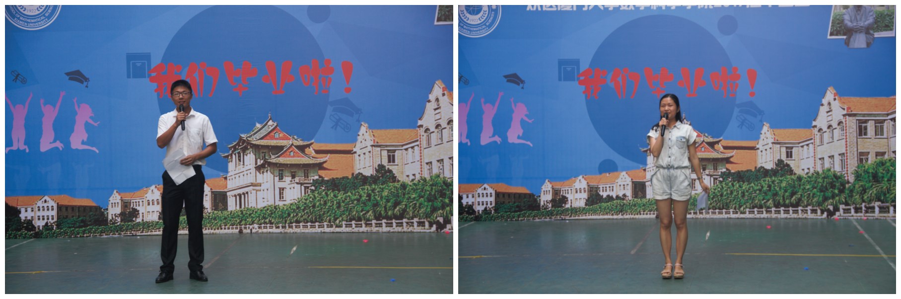 毕业生代表、2017届硕士研究生蔡庆淞和本科生胡志芳分别发言。他们表达了对数学专业深深的热爱、对学院表示感恩。作为毕业生,会谨记校训,奋发图强,终有所成以回报母校。