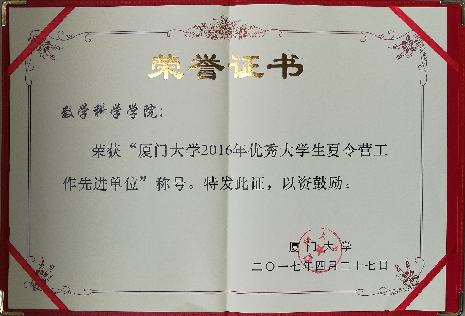 4月27日下午,学校在颂恩楼220会议室召开会议,总结表彰2016年大中学生夏令营工作,并对2017年大中学生夏令营工作进行部署。会上,学校共表彰了15个“厦门大学2016年优秀大学生夏令营工作先进单位”和29名“厦门大学2016年大中学生夏令营优秀工作者”。我院荣获“厦门大学2016年优秀大学生夏令营工作先进单位”称号,学院分管研究生工作副院长邱春晖教授代表学院上台领奖。同时,学院研究生秘书陈李媛获评“厦门大学2016年大中学生夏令营优秀工作者”。