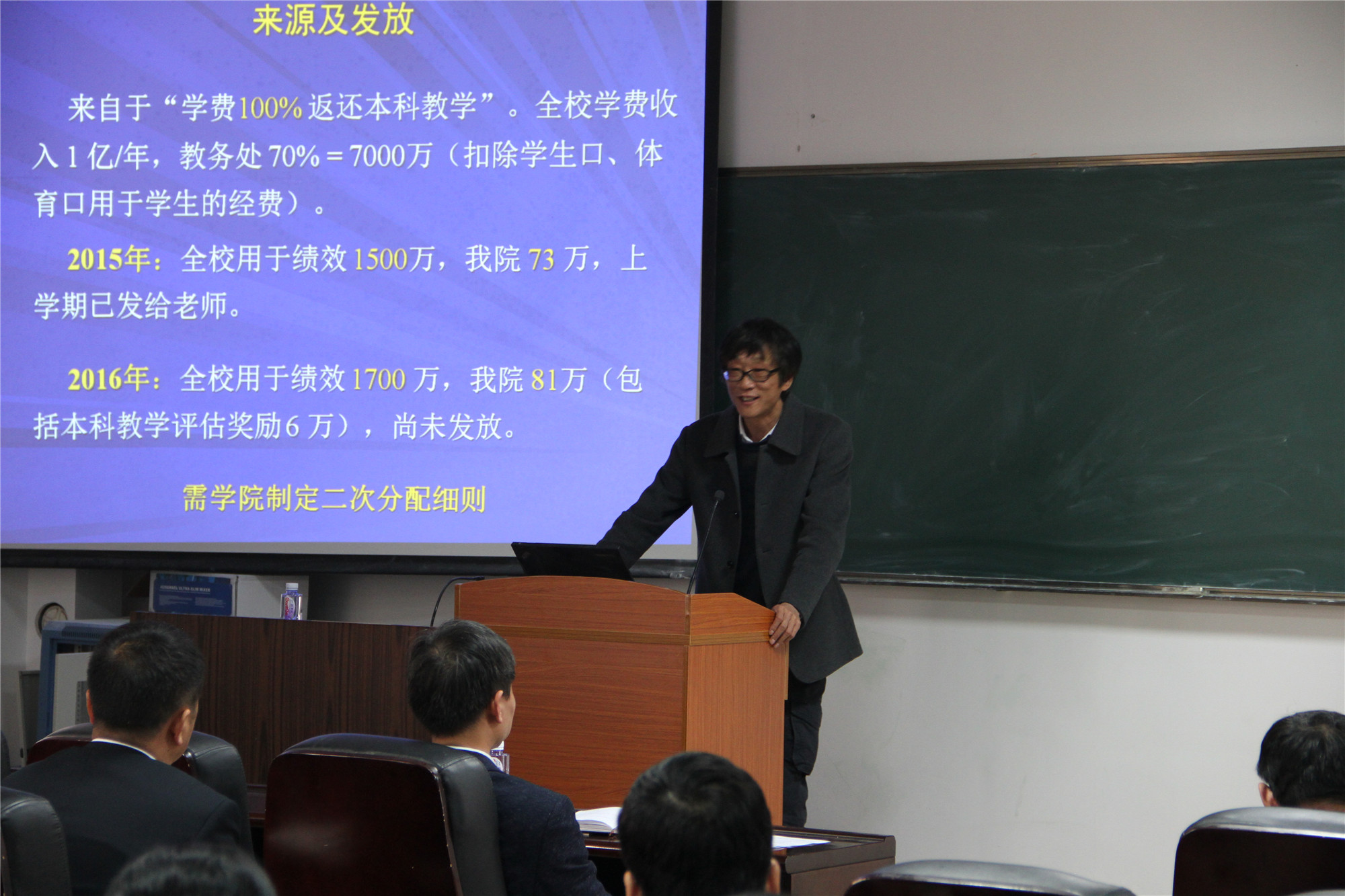 副院长钱建国对学校制定本科教学工作绩效考核办法的考核指标进行解读,指出学院也将详细征求全体教师的意见建议,制定相应考核细则,建议全院教师以考核办法为指导,进一步加强教学工作。