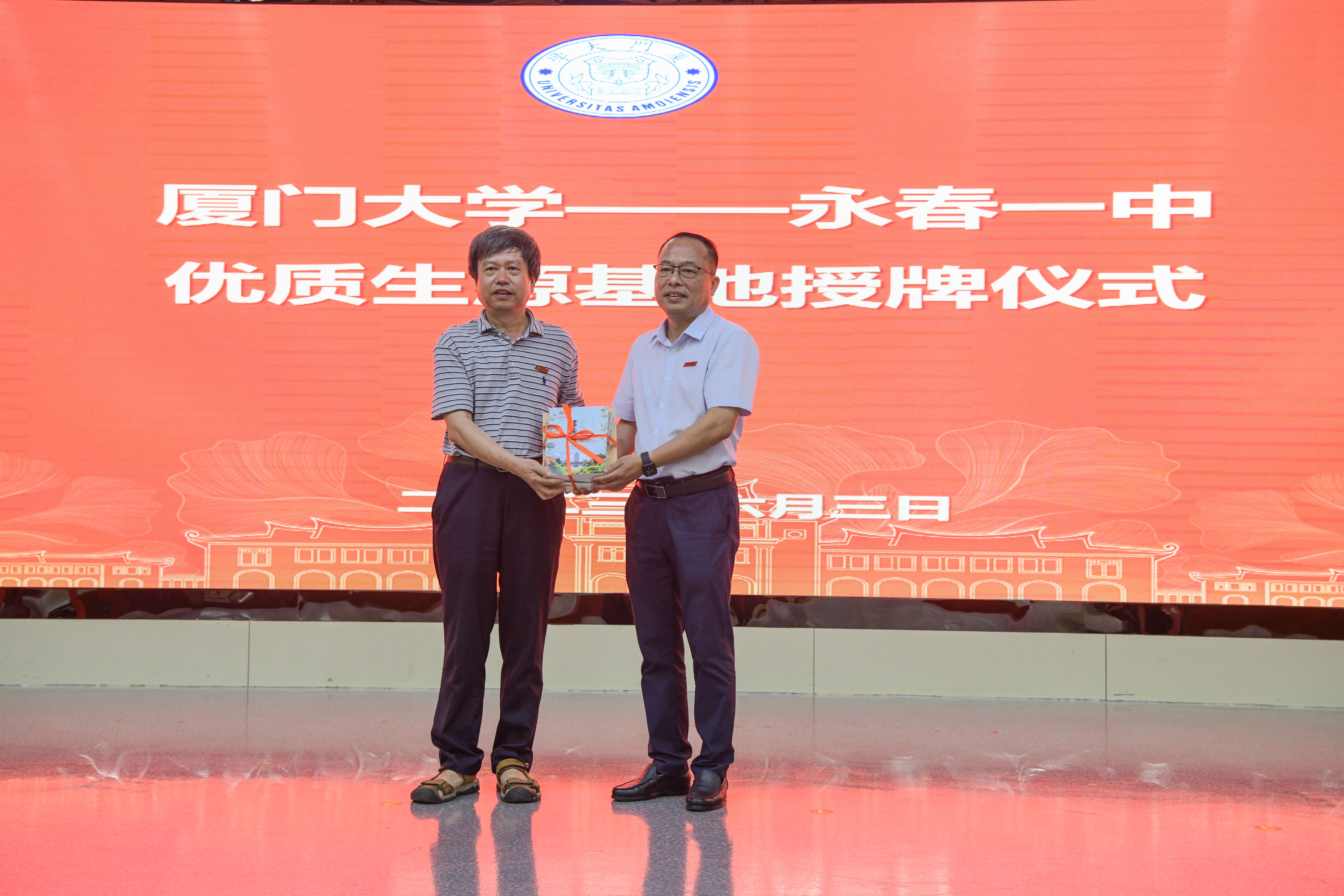 为了加强我校与永春一中的联系,进行了隆重的厦门大学优质生源基地授牌及赠书仪式。洪院士代表厦门大学向永春一中授予厦门大学优质生源基地牌匾,邱春晖教授代表学校向永春一中赠送了特色书籍。