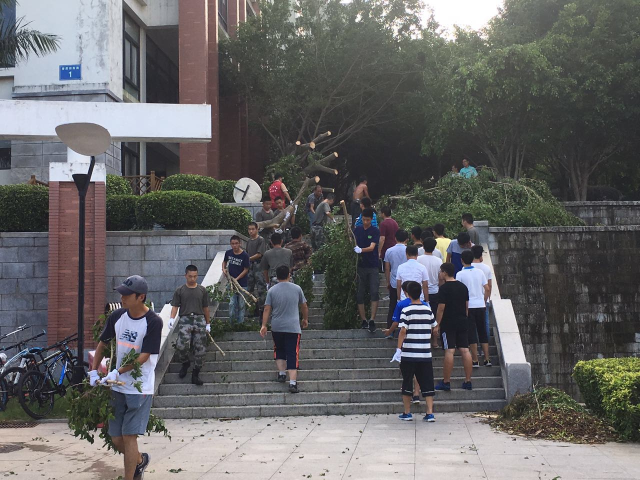 在抗击台风和灾后重建过程中,学院教师通过微信群、电话、短信等方式鼓励、慰问抗台人员,积极主动请缨前来帮忙清理,拿月饼慰问抗台人员和灾后重建人员,全体数学人众志成城、勠力同心,展现出优良的主人翁精神。