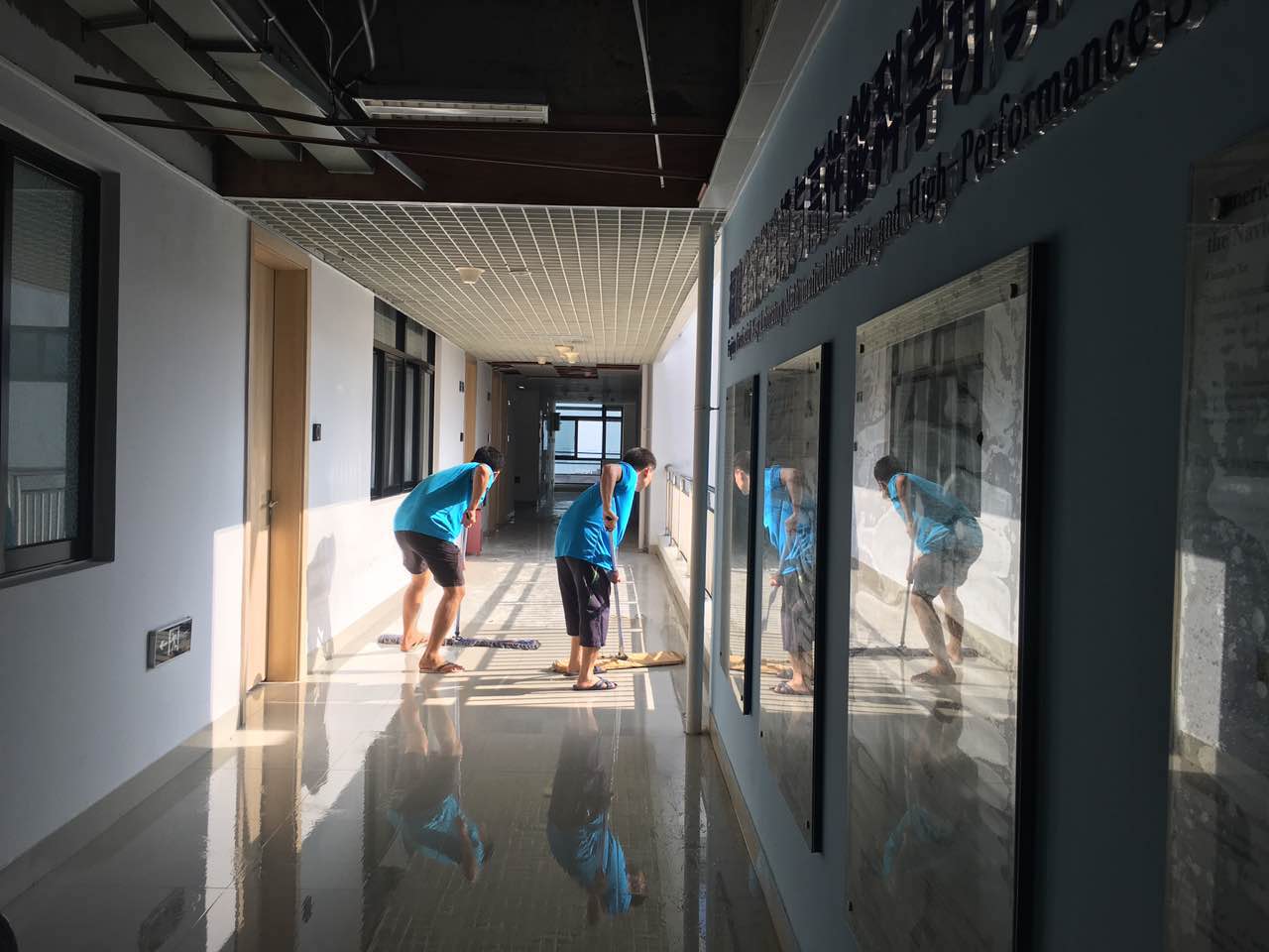 台风过后,15日一大早,学院即组织检查学院辖内所有办公室、会议室、报告厅、自习室、讨论室等公共场所,并立即开展灾后清理工作,将掉落铝扣板统一收拾归位,清理大块垃圾和走廊及自习室积水。同时,张明智书记、张剑文副书记和辅导员陈淑铌走访学生宿舍,慰问学生