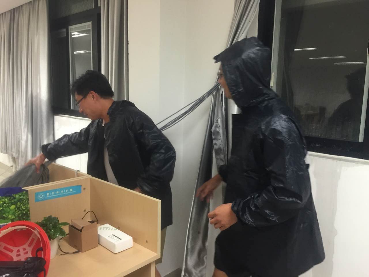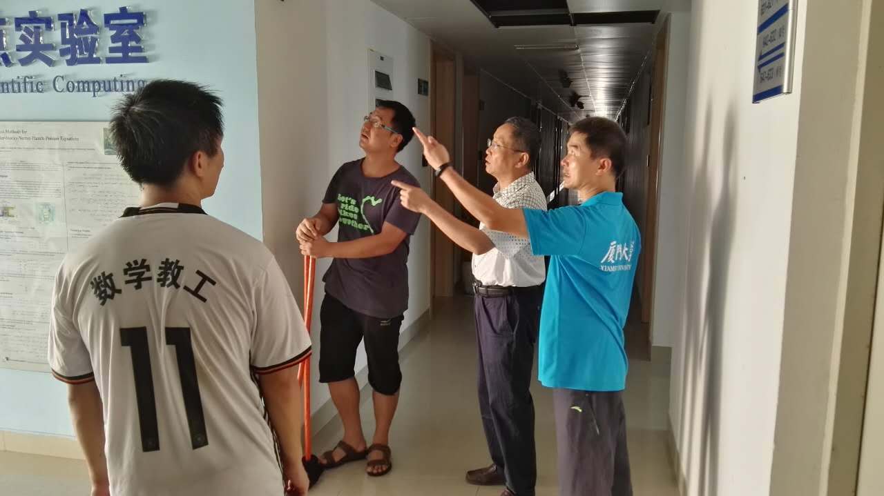 9月15日凌晨,2016年第14号台风“莫兰蒂”从厦门市翔安区登陆,登陆时近中心最大风力15级(48米/秒),为强台风级别。由于数学物理大楼建筑结构设计问题,学院受了一定的损失,主要包括:由于数理大楼六层通往露天阳台的走廊没有安装门导致铝扣板吊顶被吹落,风雨从数理大楼报告厅门口和学生自习室门口的露天走廊灌入导致六层走廊和自习室积水,教师办公室北面窗户渗水导致办公室积水。