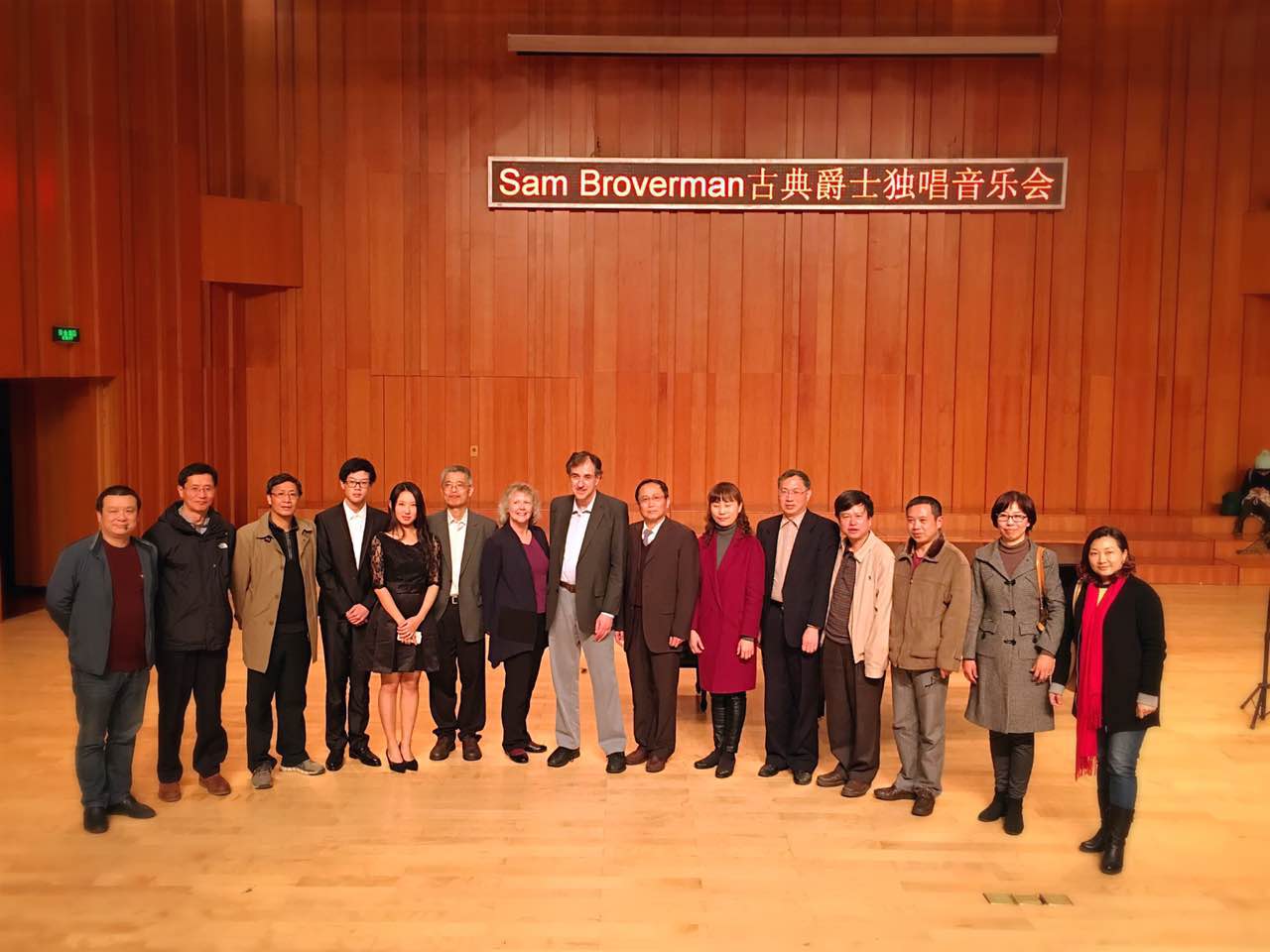 Sam Broverman的好友——我院双聘教授老师主持了音乐会。Sam教授演唱了数首经典的古典爵士音乐,给观众们带来了一场来自大洋彼岸的视听盛宴。音乐会尾声,Sam教授加演了加拿大著名民谣《红河谷》,台上台下和声齐唱,将音乐会推向高潮。演出结束后,林亚南院长等学院领导、嘉宾与Sam教授夫妇合影留念。