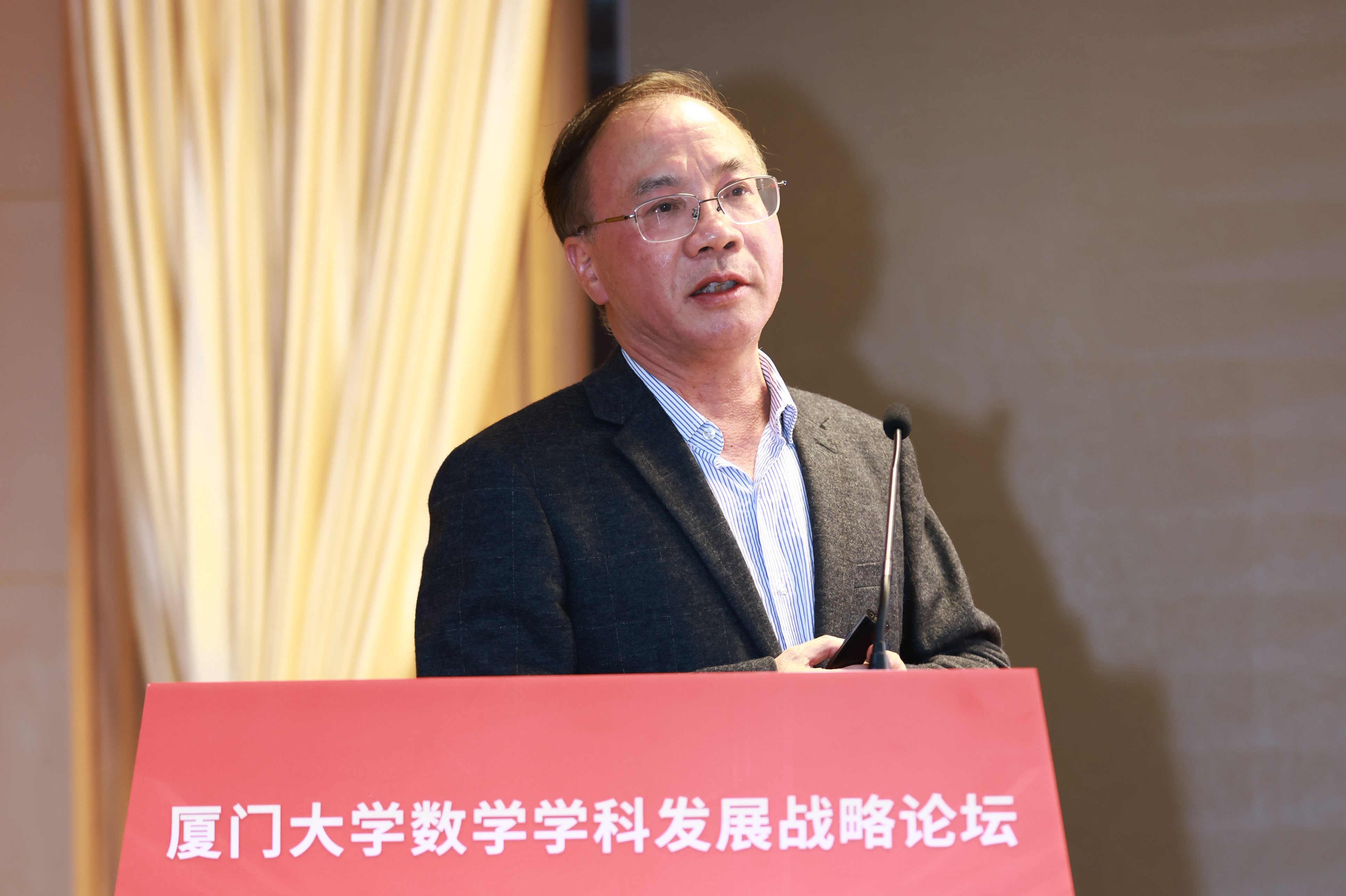 为庆祝厦门大学数学学科创立100周年,凝聚学科发展力量,进一步推动厦门大学数学学科高质量创新发展,12月15日晚上,厦门大学数学学科发展战略论坛在厦门大学科学艺术中心顺利召开。中国科学院院士、中国数学会理事长、北京大学田刚教授,中国科学院院士、南开大学张伟平教授,中国科学院院士、中国数学会计算数学分会理事长、国家自然科学基金委江松研究员,中国科学院院士、清华大学王小云教授,中国科学院院士、中俄数学中心主任、北京大学张继平教授,中国科学院院士、中国科学技术大学叶向东教授,中国科学院院士、中科院数学与系统科学研究院院长张平研究员及来自国内各高等学校、研究院的知名专家学者百余人受邀参会,为我校数学学科发展出谋划策。厦门大学部分部处领导和部分教师代表参加本次论坛。论坛由厦门大学副校长方颖主持。