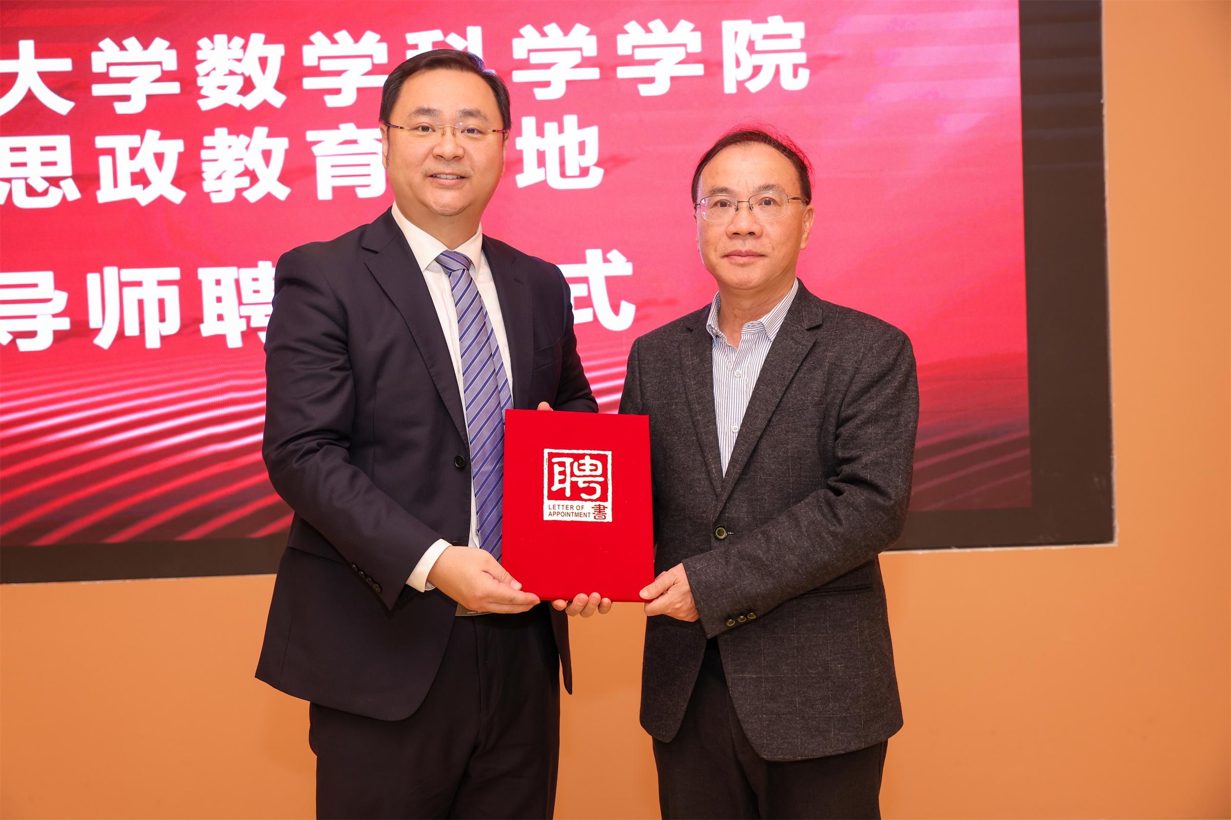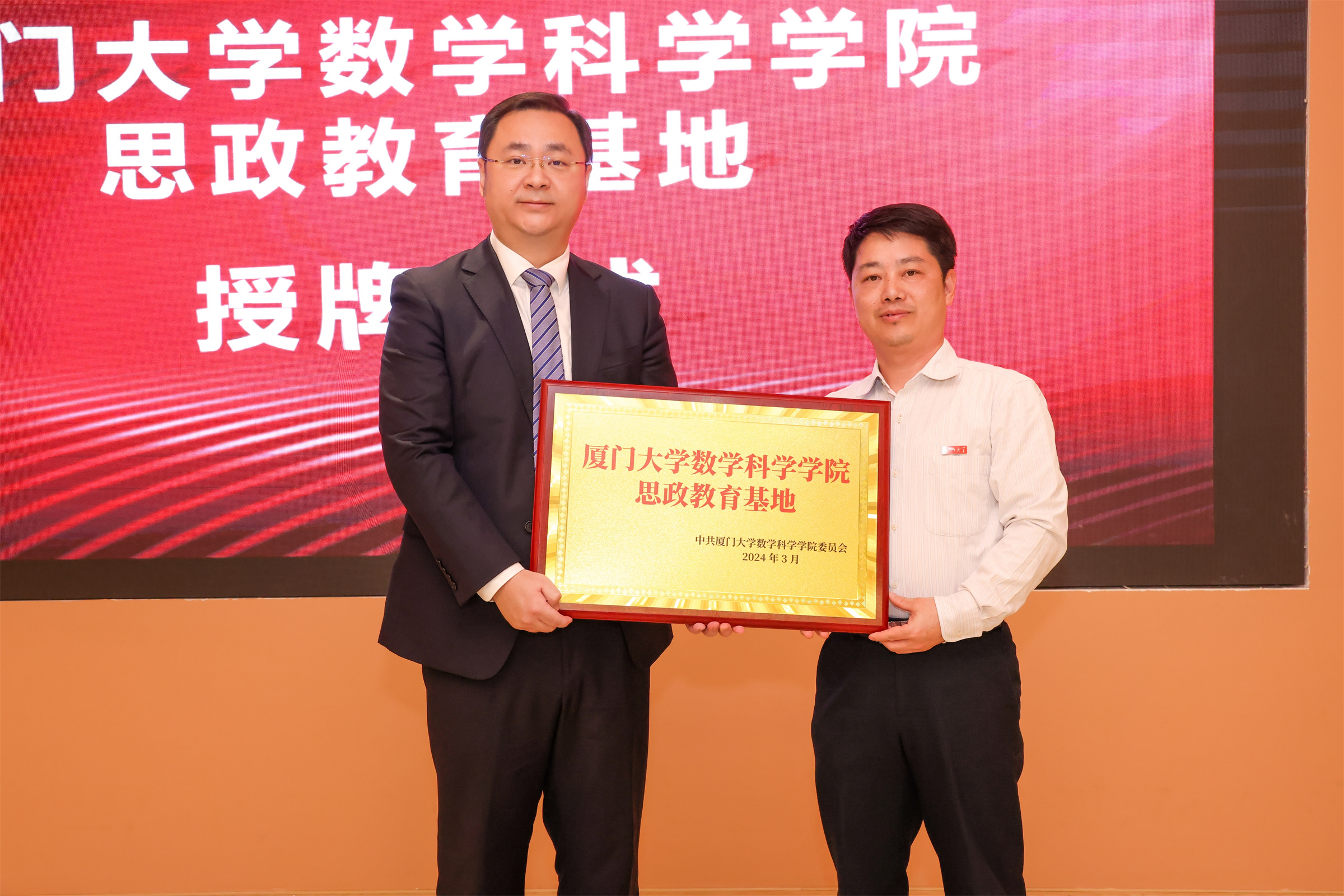 厦门大学数学科学学院党委书记张清榕代表学院为陈景润科学精神教育基地授予“厦门大学数学科学学院思政教育基地”,厦门大学数学科学学院院长谭绍滨教授为陈由伟先生颁发“厦门大学数学科学学院思政教育基地导师”聘书。