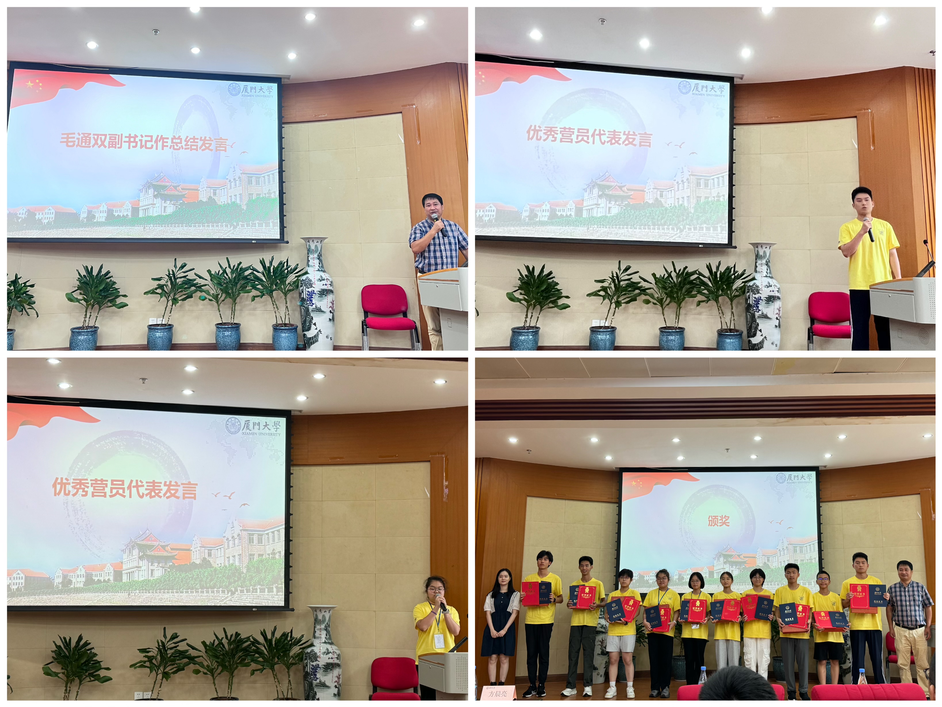 7月27日,2024年数学科学学院中学生夏令营结营仪式顺利举行。数学科学学院党委副书记毛通双、团委书记方晨亮、团委副书记许温洁及全体营员参加了仪式。仪式上播放夏令营的视频集锦,展示了每一天的夏令营生活和营员们的成长故事,并为营员颁发优秀营员证书、结业证书。毛通双副书记对本次夏令营进行总结,他对营员的参与热情和学习能力给予高度肯定,希望营员继续努力,实现个人的成长和进步,不断提高自我。优秀营员代表何瑞康、林彦呈、郑茜蔓和秦奕楠同学依次分享感悟,他们对夏令营期间老师和助教们的无私奉献表示感谢,丰富的活动让他们感受到了厦门大学的底蕴和数学学科的魅力,也对未来的学习有了更加明晰的规划。