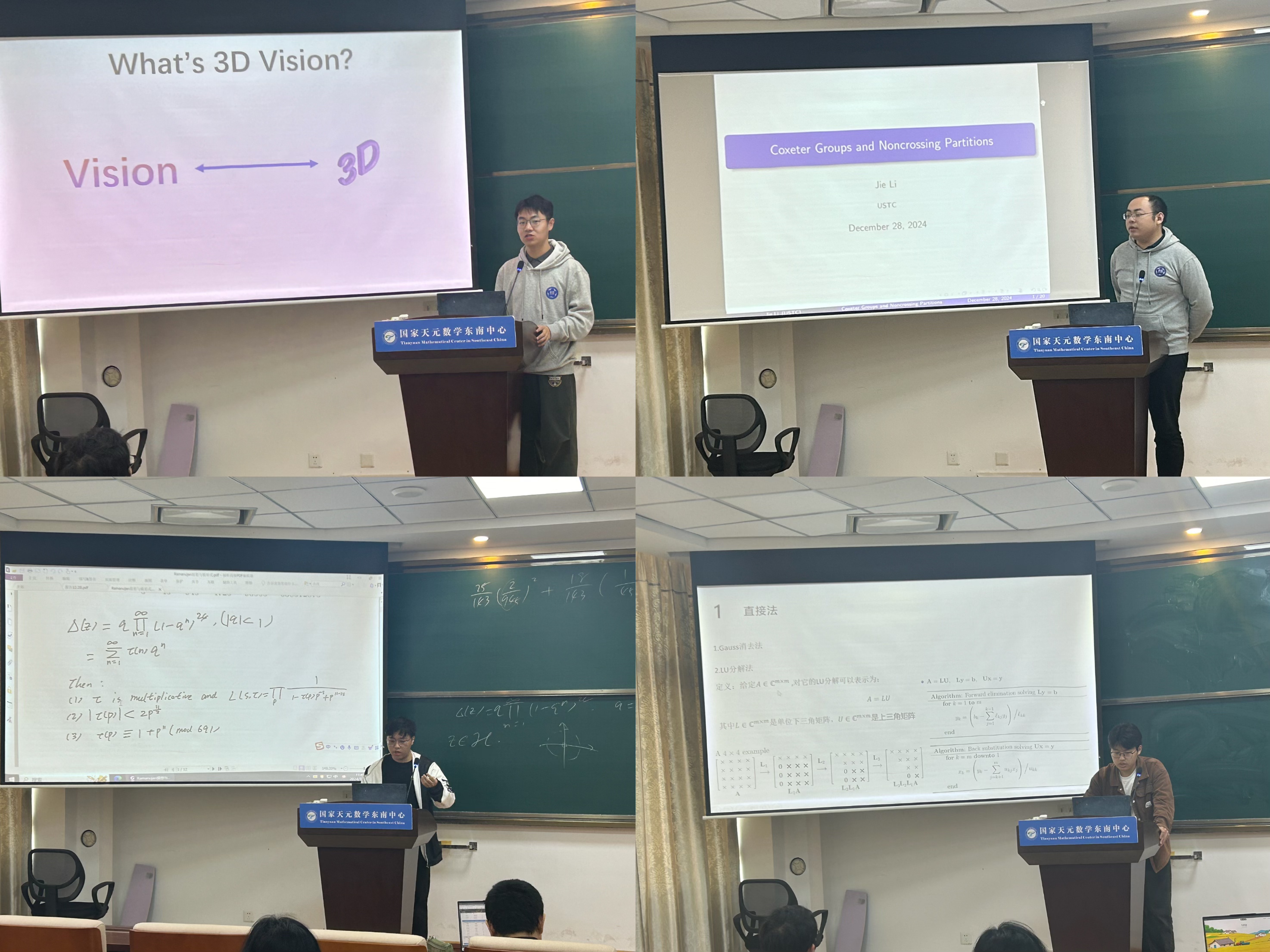 交流报告环节在学院实验楼S102报告厅举行,两院同学分享研究成果,共同探讨解决数学问题的创新方法。中科大蒋泽豪分享了课题组在AI图形动画领域的工作进展,李杰介绍了Coxeter群和非交叉划分的重要概念和性质,我院张衎介绍了Ramanujan猜想与模形式的证明,杨锦涛介绍了数值代数中求解线性方程组的直接方法和迭代方法。