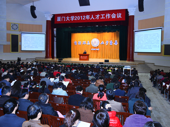 1月11日-12日,厦门大学2012年人才工作会议隆重举行。校长朱崇实在11日上午的开幕式上做题为《树立科学人才观,实施人才强校战略,加快世界知名高水平研究型大学建设》的工作报告,强调指出,要认真贯彻落实全国人才工作会议和《国家中长期人才发展规划纲要》精神,进一步增强责任感、使命感和紧迫感,科学规划、深化改革、重点突破、整体推进,努力形成全校“重才、聚才、用才、爱才”的良好氛围,为加快建设世界知名高水平研究型大学提供坚实的人才保障。
