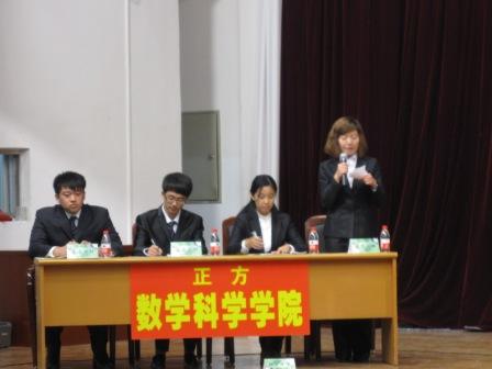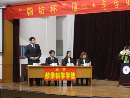 12月15日晚19时,“翰坊杯”厦门大学第六届学生辩论赛决赛在法学院模拟法庭举行。决赛辩题是“高额农业补贴能否有效缓解粮食危机”,对阵双方为正方数学科学学院与反方土木与建筑工程学院,我院观点是“高额农业补贴可以有效缓解粮食危机”。我院党委副书记郑诚明、辅导员陈向柳和60多名09、10级同学前来助威。