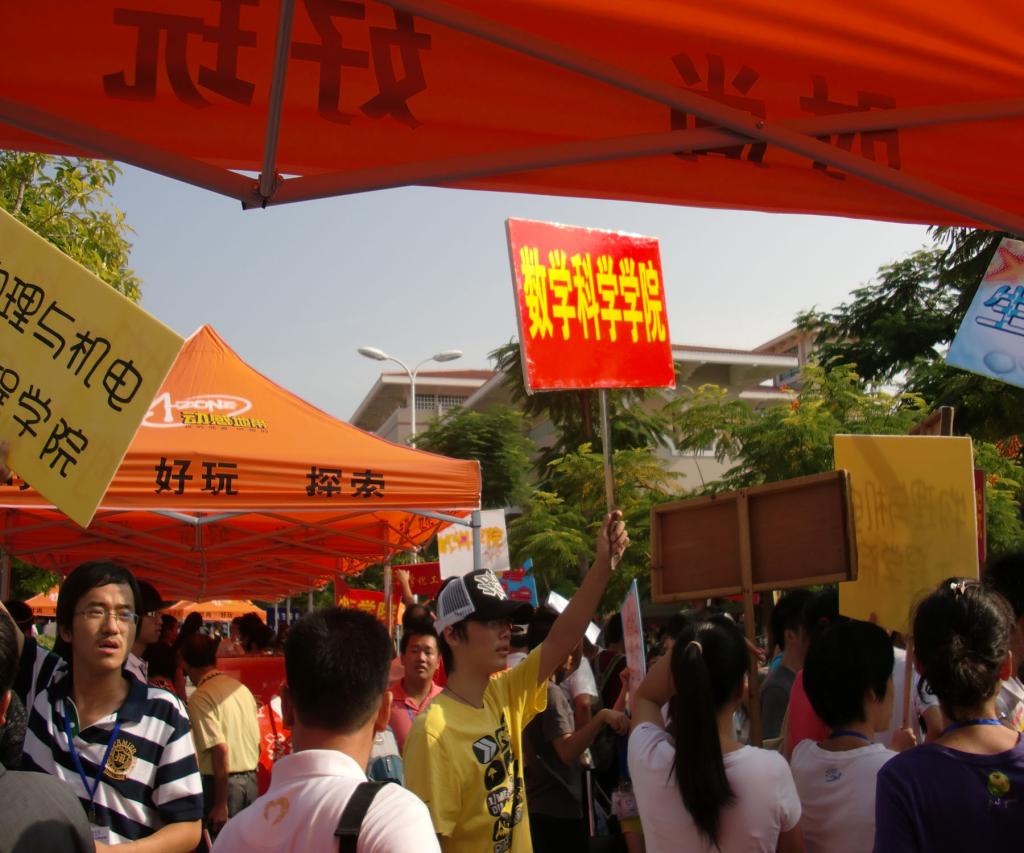 10级志愿者的迎新热情随气温不断高涨,引导组的志愿者们翘首以盼,其先锋部队在迎新专车下车点高举”数学科学学院”的牌子,让数院的学弟学妹能够第一眼找到归属感。