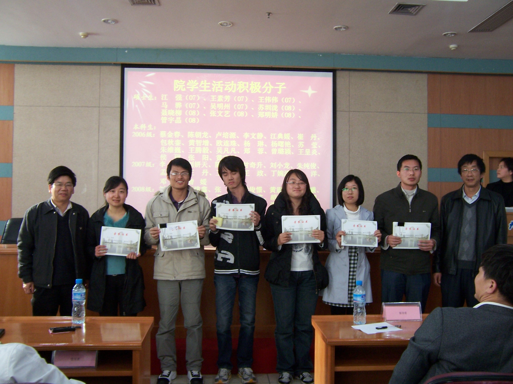 信息与计算数学系主任卢琳璋教授、数学与应用数学系主任钱建国教授为获得学院表彰的“三好学生”、“优秀学生干部”、“学生活动积极分子”颁发证书
