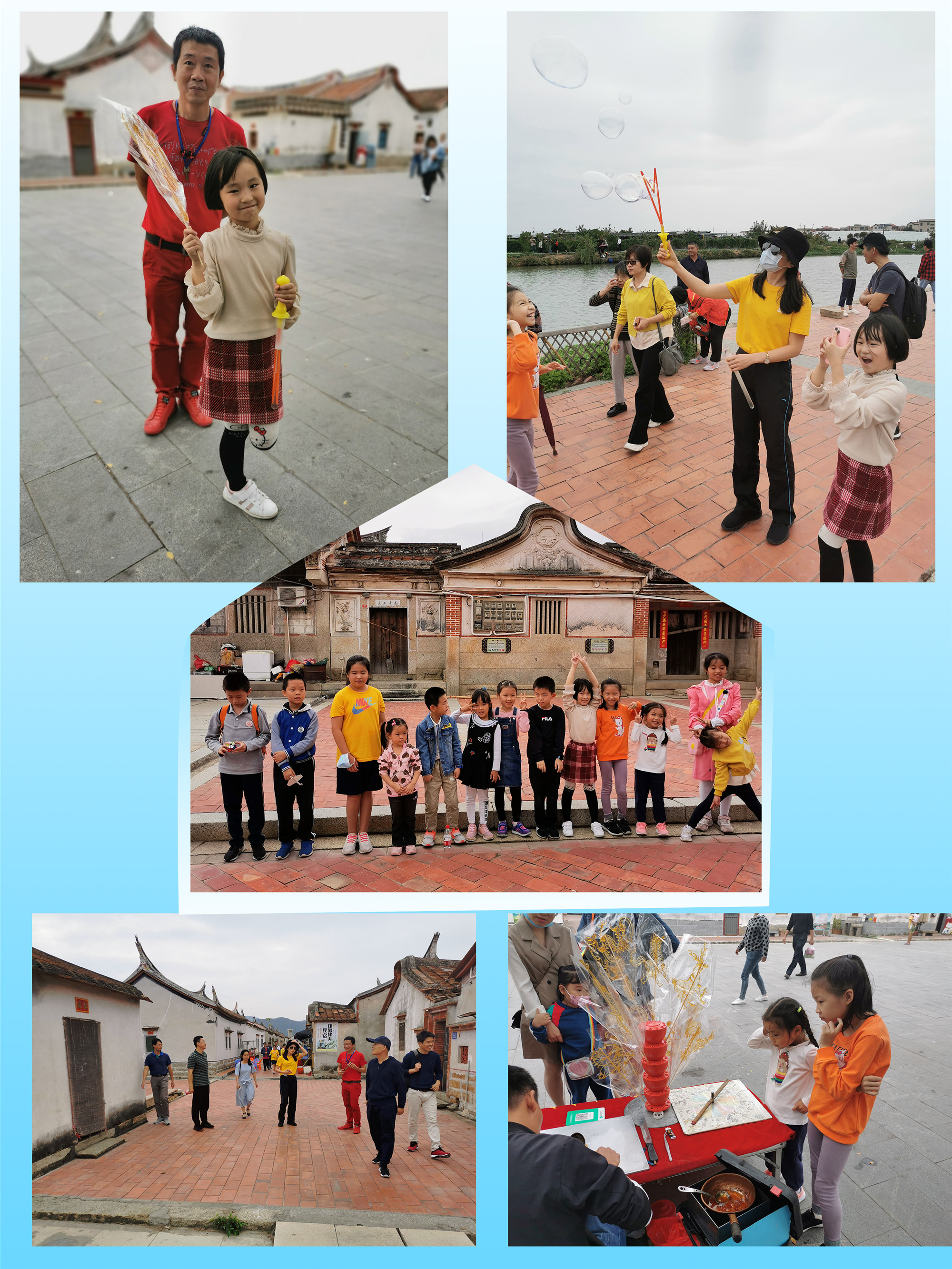 一路聊着、笑着,不知不觉来到了目的地。先到美山村参观古建筑,短暂停留之后,再转道埭美村参观民居古厝群。据说埭美古厝建于明朝,至今有600多年的历史了。古厝群傍水而建,布局呈轴对称排列、多层次进深、前后左右有机衔接,严谨整齐,好似一个大“矩阵”。屋顶多为硬山式曲线燕尾脊,红瓦屋面,石砌墙体,装饰工艺极为精湛,木雕、砖雕、泥塑在梁、拱、窗花等构件上的运用令人叹为观止。呼吸着乡村的清新空气,闲游在古厝群里石板巷中, 推推磨面的磨坊,品尝闽南地道小吃锅边糊、麻糍。看着老人们沐浴在暖阳下闲坐,孩子们吹着七彩泡泡、吮着麦芽糖、相互追逐嬉戏,不禁让人想起辛弃疾的《清平乐·村居》---“茅檐低小,溪上青青草。醉里吴音相媚好,白发谁家翁媪? 大儿锄豆溪东,中儿正织鸡笼。最喜小儿亡赖,溪头卧剥莲蓬。”