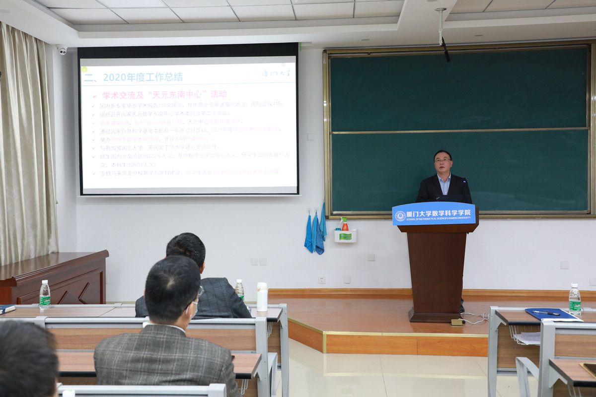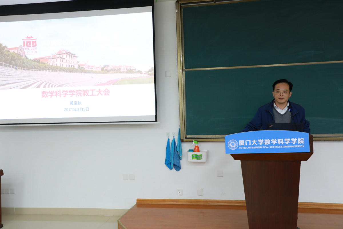 会上,黄宝秋书记结合传达校党委书记张彦和校长张荣在学校2021年工作布置会上的讲话精神以及学校新一年工作计划要点,布置院党委2021年重点工作。他强调,过去一年是极不平凡、令人难忘的一年,院党委以习近平新时代中国特色社会主义思想为指导,围绕管党治党、立德树人根本任务,团结带领全体师生员工一手抓好常态化疫情防控、一手推动高质量内涵式发展,在应对新冠疫情、做好复学复课、接受校党委巡察、谋划“十四五”规划、做好第五轮学科评估、推进国家天元数学东南中心建设等重大挑战、重大任务中发挥了应有的政治核心作用,学院各项事业基础更加扎实、发展态势更加向好。他指出,2021年是“十四五”规划的开局之年,也是两个百年目标的交汇与转换之年,要坚守为党育人、为国育才初心,扎实开展党史学习教育,用新时代新思想培根铸魂,对标对表、担当作为,守正创新、提质增效,努力以学院党的建设新成效和事业发展新进步迎接建党百年和建校百年。