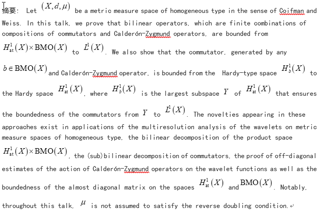报告人简介:付星博士的研究方向为调和分析, 主要从事在(非)齐型度量测度空间上的函数空间及其应用方面的研究,其研究工作先后发表在 Appl. Comput. Harmon. Anal, J. Fourier Anal. Appl.和 J. Geom. Anal. 等国际著名杂志上。