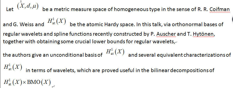 报告题目:Wavelet characterizations of the atomic Hardy space on spaces of homogeneous type and their applications