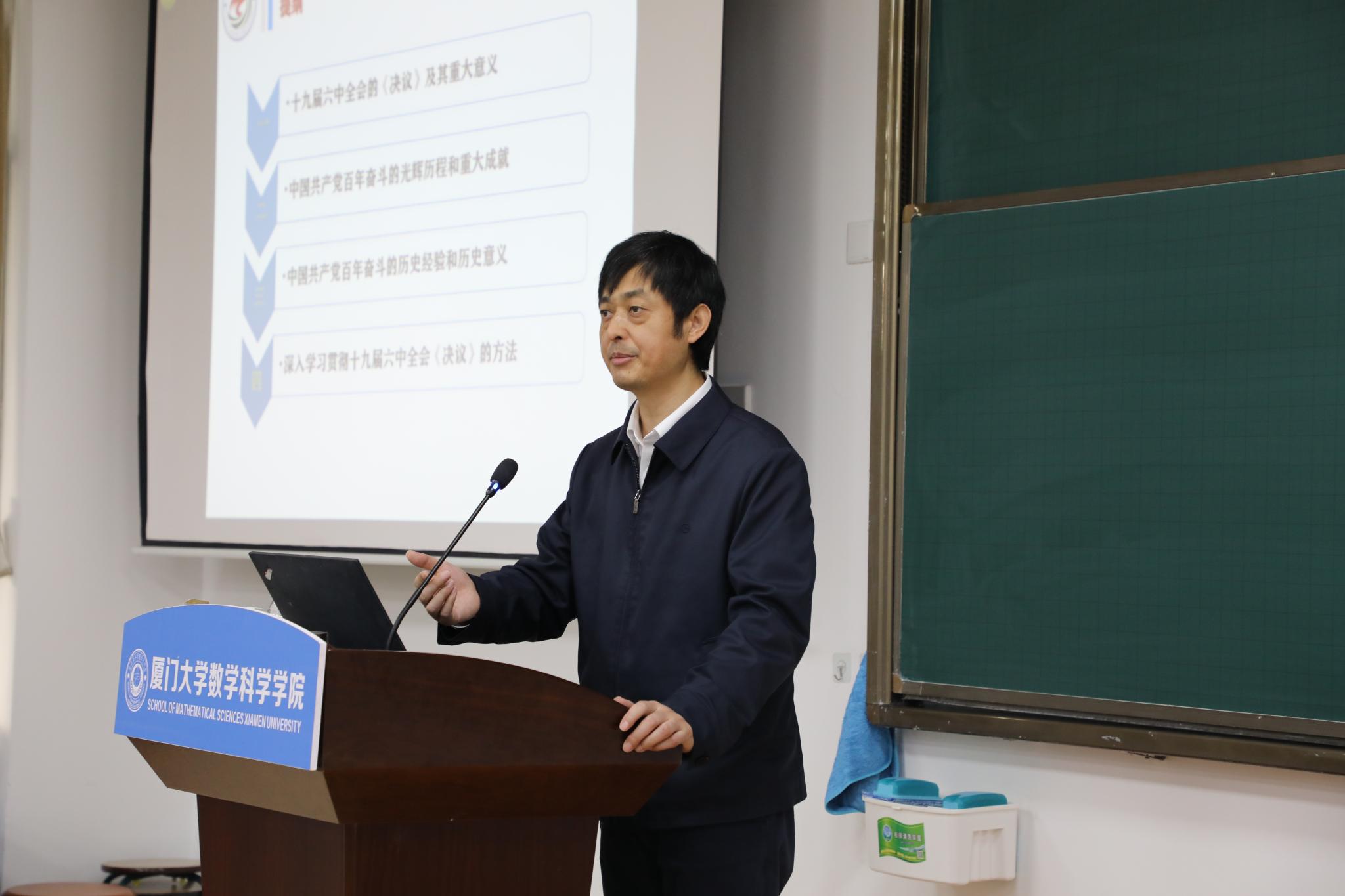 12月14日上午,数学科学学院党委理论学习中心组学习暨党的十九届六中全会精神专题辅导报告会在海韵实验楼106报告厅召开,特邀马克思主义学院常务副院长张有奎教授作《中国共产党百年奋斗的重大成就和历史经验 ——十九届六中全会精神解读》专题宣讲,院党委书记黄宝秋、院长谭绍滨等党政班子成员、师生党员、入党积极分子代表近120人参加会议,院党委副书记丁昌利主持报告会。