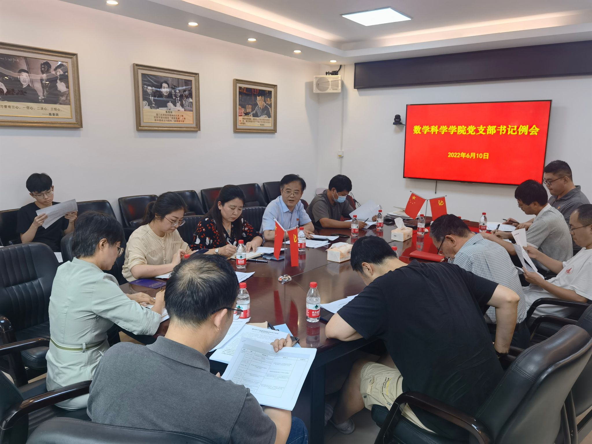 2022年6月10日上午,数学科学学院党支部书记例会在海韵行政楼313会议室召开,院党委书记黄宝秋,党委副书记毛通双、丁昌利,党务秘书曹璐及全体党支部书记参加会议。