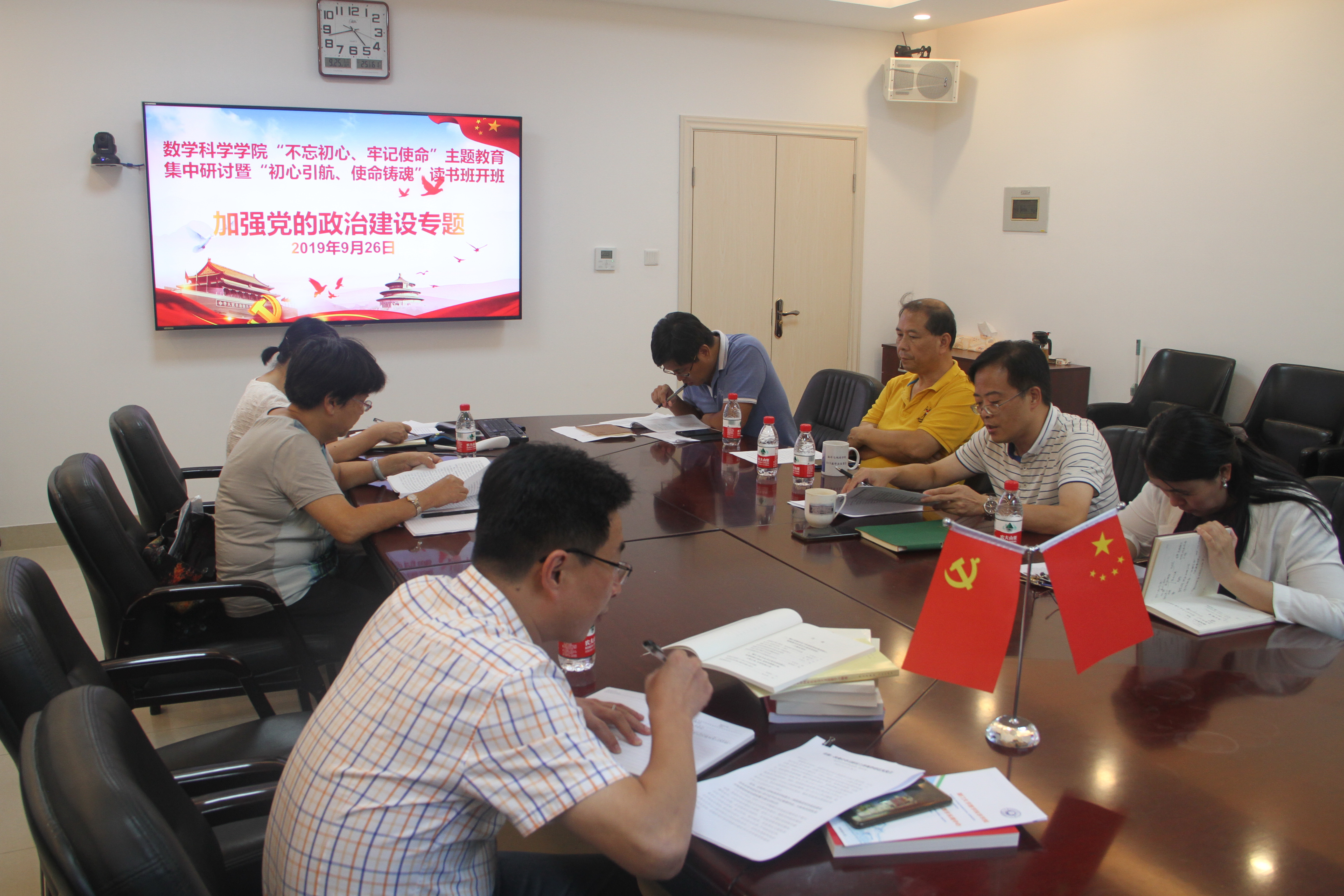 主题教育开展以来,数学科学学院党委紧扣“不忘初心、牢记使命”的主题和学习贯彻习近平新时代中国特色社会主义思想的主线,自觉将学习研讨抓在前头、贯穿始终,努力做到理论学习有收获。院党委突出处级党员领导干部教育重点,通过领学、主发言、交流发言、观看专题片、现场教学等方式,引导大家读原著、学原文、悟原理,推动学懂、弄通、做实。目前已开展两次集中学习研讨。