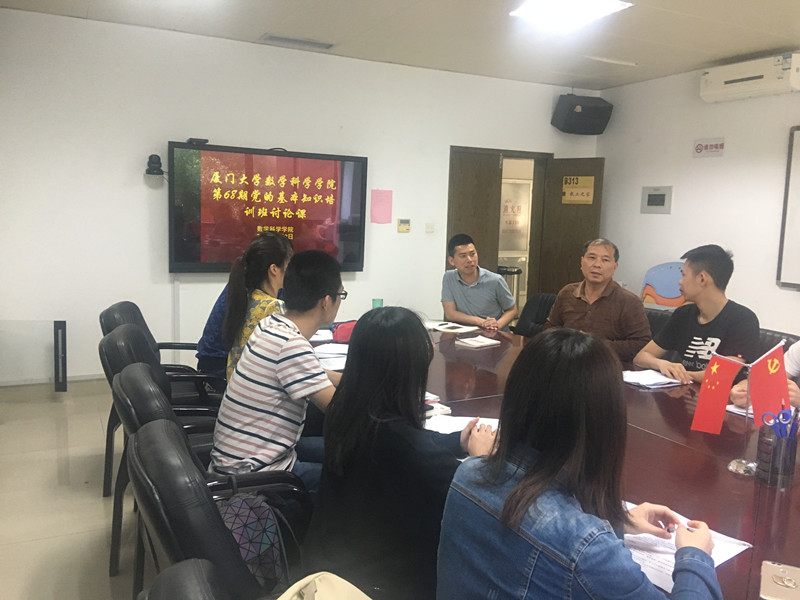 2018年4月2日中午,数学科学学院第68期党的基本知识学习班小组讨论在海韵行政楼B313举行,学院党委副书记陈国强、带队老师石义凯参加了小组讨论。