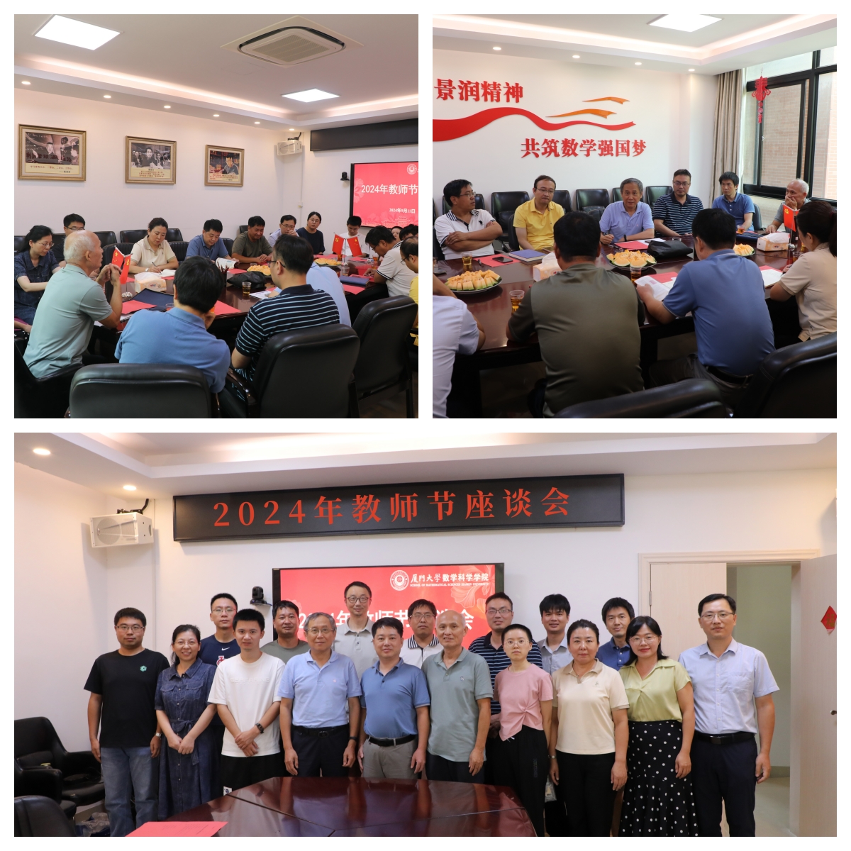 为热烈庆祝第四十个教师节,2024年9月11日上午,数学科学学院在海韵园行政楼B312会议室召开以“大力弘扬教育家精神,加快建设教育强国”为主题的教师节座谈会。院党委书记张清榕,院党委副书记毛通双,丁昌利,院党委委员、副院长金贤安,院党委纪检委员、工会主席张文出席,老中青教师代表参加会议。座谈会由毛通双主持。
