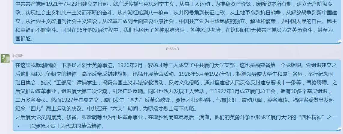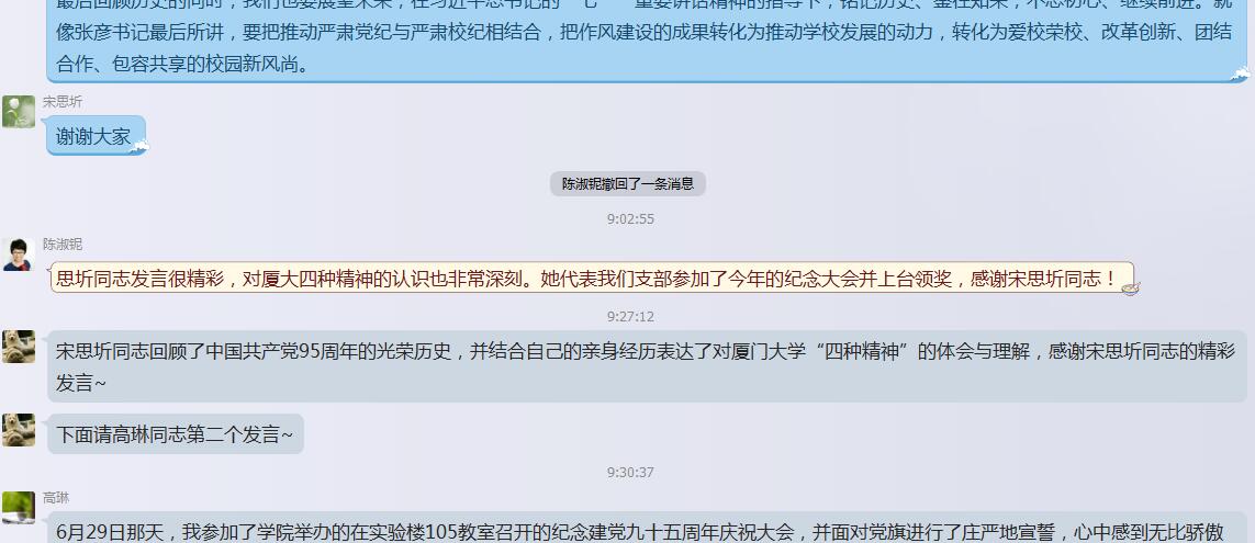 随后,与会党员积极发言。宋思圻同志回顾了中国共产党95周年的光荣历史,并结合自己的亲身经历表达了对厦门大学“四种精神”的体会与理解。