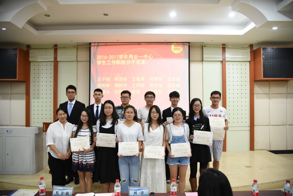 刘宁老师为2016-2017学年“两会一中心”学生工作积极分子颁发奖状,对他们的付出予以充分肯定。