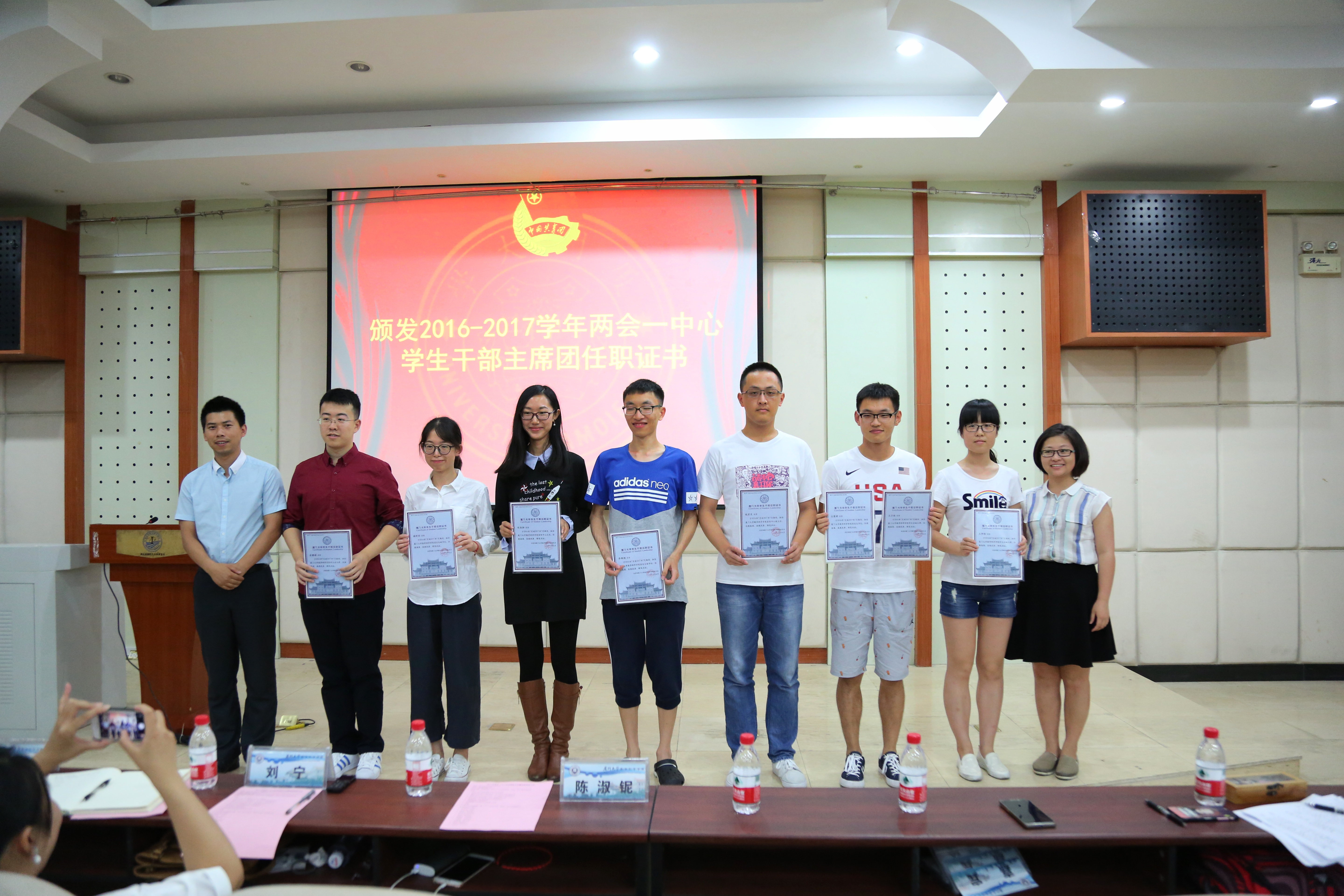 石义凯、陈淑铌老师为2016-2017学年“两会一中心”主席团颁发了聘书,代表着主席团干部任期届满。
