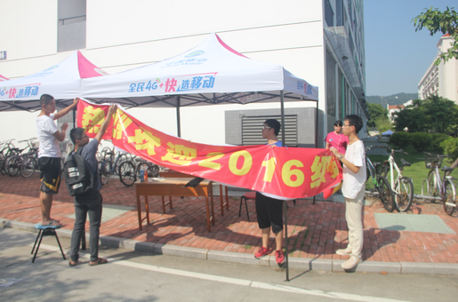 下午三点,学生干部在本部到位,进行学院迎新工作站点布置。搭帐篷,摆桌椅,贴海报,准备院旗、院牌、横幅、展架和新生发放材料,同时“迎新系统”工作人员在现场进行网络连接测试,为明天迎新工作的开展做好万全准备。