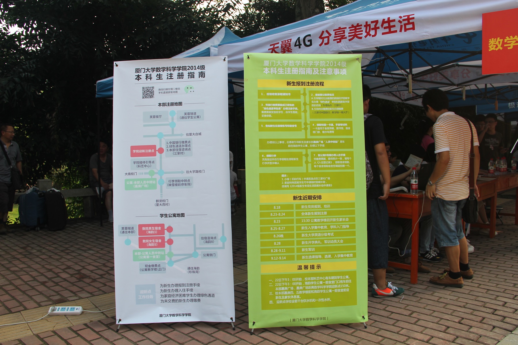 今年迎新我院有了很大的创新。首先,报到前一个月,微信迎新活动已经轰轰烈开启,《KY.COM迎新期间交通管制的通知》、《学生工作到底是什么?》、《厦大攻略?》、《首先,你得有一个旅行包》等一系列新生攻略给还未到的14级新生一个对大学生活的初印象。其次,新生qq群的建立,让学弟学妹与学长学姐有一个提前交流的平台,满足自己对大学的好奇心。在迎新期间,我们还举行了为新生及其家长合影留念的活动,用相机为新生留下大学报到第一天这一值得纪念的一天。我院注册点的简易地图也是我院一大特色,并且地图附有二维码,新生和家长们只要“扫一扫”便可获得该地图的电子版,避免了自己“迷失”在厦大。