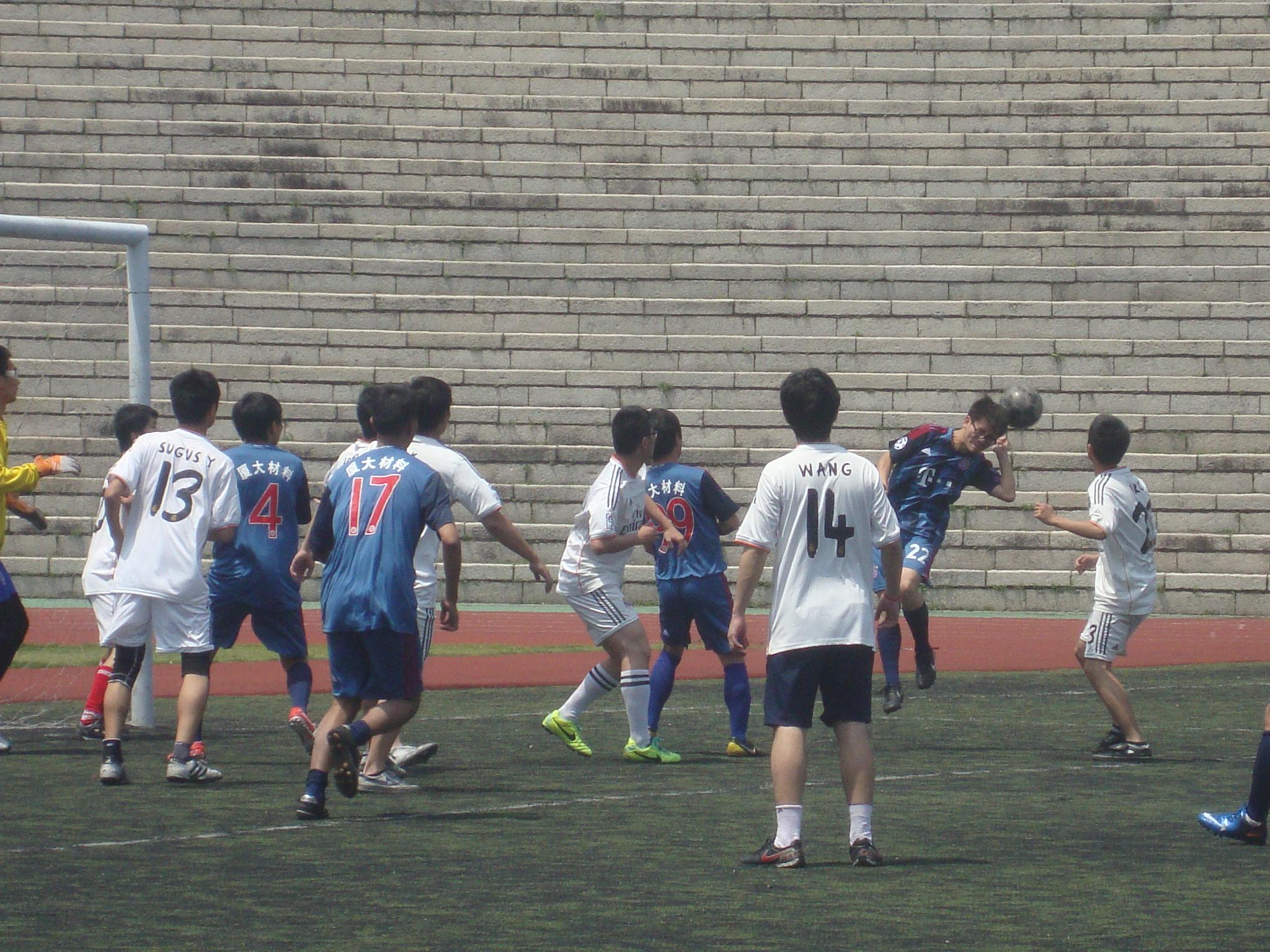 比分落后之后,数院队员们明显有些慌乱,传球多次失误,材料抓住时机开始了潮水般的进攻。材料队员脚下技术细腻,后防球员难以单防住对手,一个球员往往能牵制两到三位的防守球员。材料通过耐心地倒脚,很快获得了机会。通过连续地传递,对方前锋在禁区内舒服地接球,在无人防守的情况下一脚角度刁钻的射门,门将扑救不及。数院大门再次告破,0:2。
