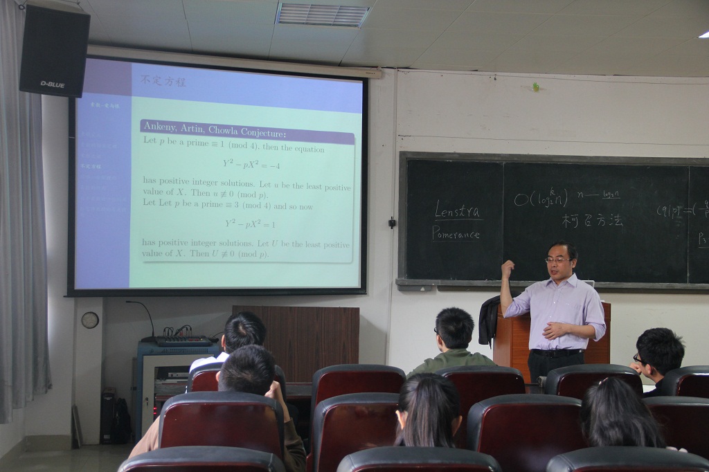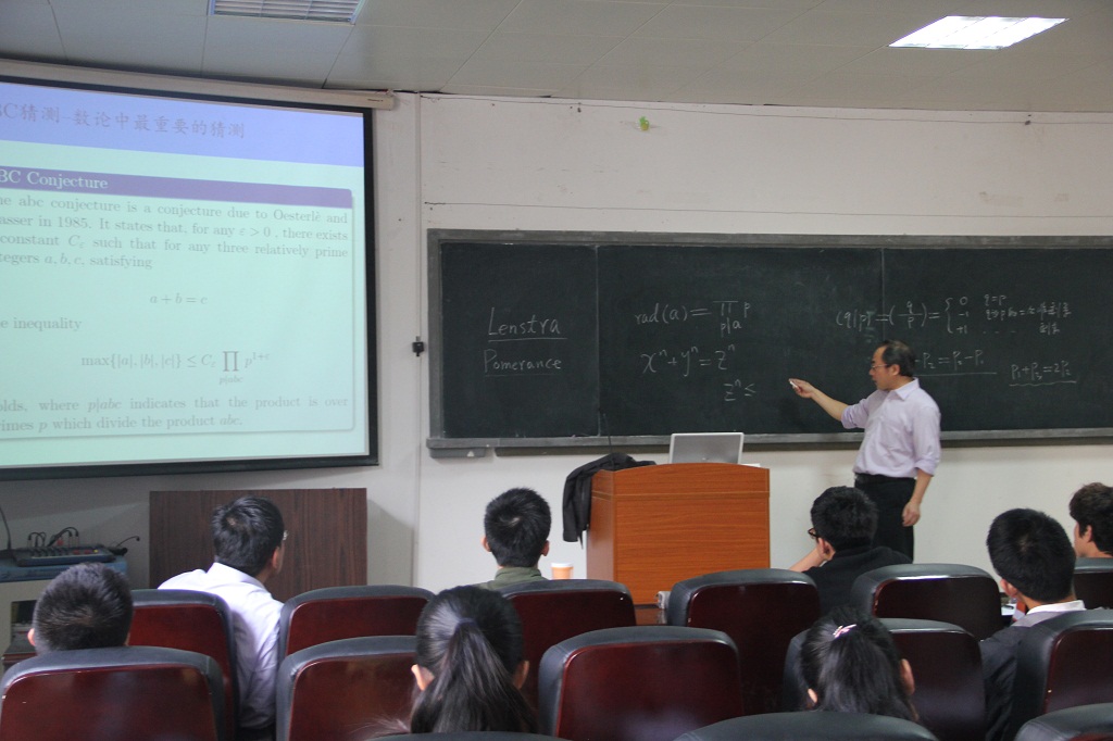2013年12月8日上午10:00,我院“魅力数学”系列讲座之第十三讲——素数-爱与恨在海韵实验楼105举行。本次讲座的主讲人是来自华南师范大学的袁平之教授,主要研究方向为数论及应用。副院长钱建国教授,数学与应用数学系主任金贤安教授,祝辉林老师以及“拔尖人才计划”全体同学参加了本次讲座。
