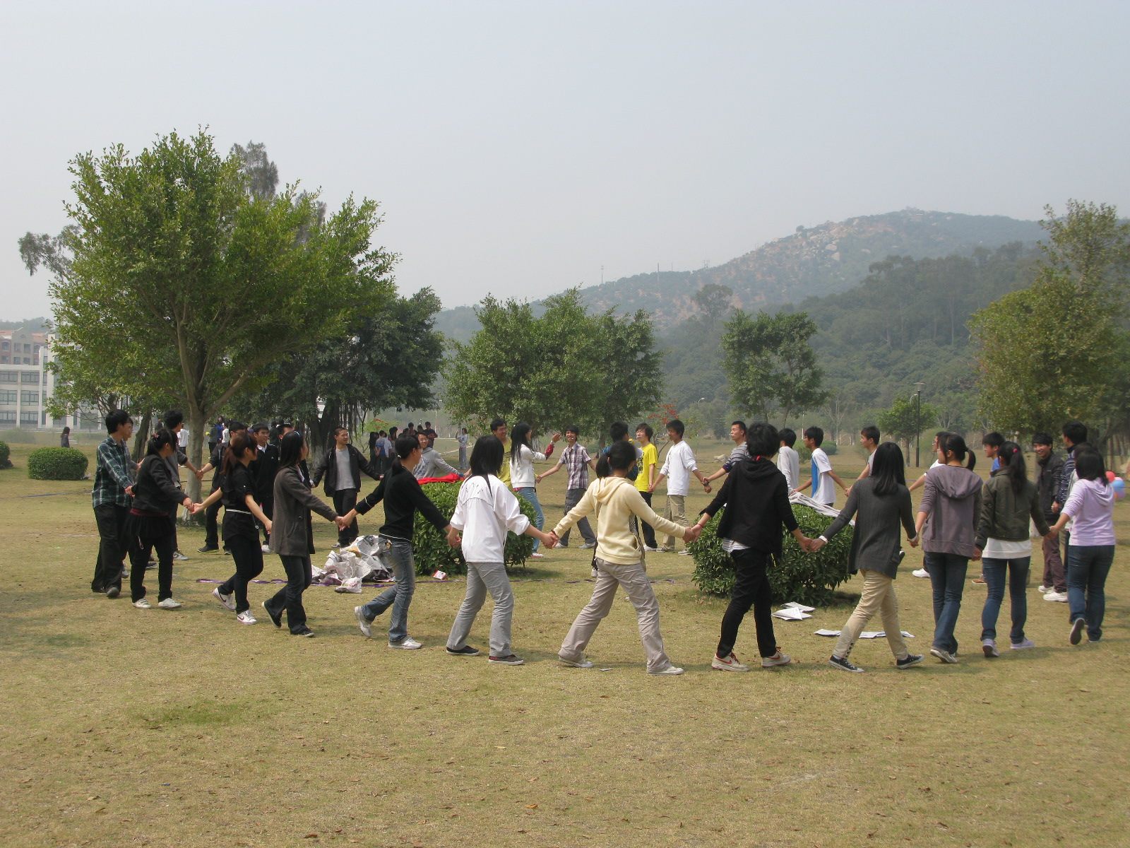 在团支部及班委布置过的草坪上,同学们兴致高昂的抽签分组,并进行了“坐地起身”、“无敌风火轮”、“真心话大冒险”等素质拓展游戏。